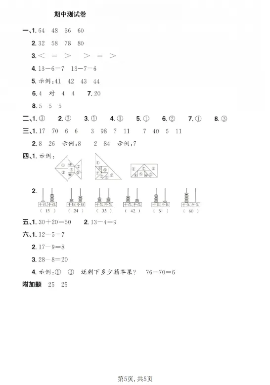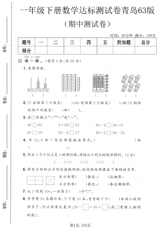 26(新版)一年级数学下册青岛63版期中检测卷共5页完整版,电子版高清可下载可打印。因篇幅有限,仅展示部分内容。有需要的家长快给孩子领取一份,让孩子练习吧!