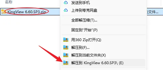 1.解压安装包:鼠标右击【KingView 6.6 SP3】压缩包,选择电脑上安装的解压软件,点击【解压到KingView 6.6 SP3】。