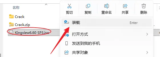 3.件夹找到并选【Kingview6.60 SP3.iso】文件,鼠标右键选择【装载】(如果没有【装载】选项的可以右键选择【打开方式—Windows资源管理器】打开,Win7系统点击鼠标右键解压)。