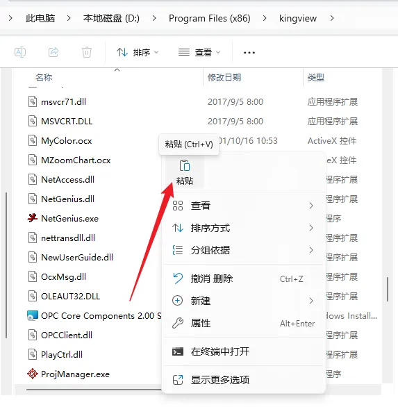 36.在打开的文件夹空白处,鼠标右键【粘贴】刚才复制的文件。