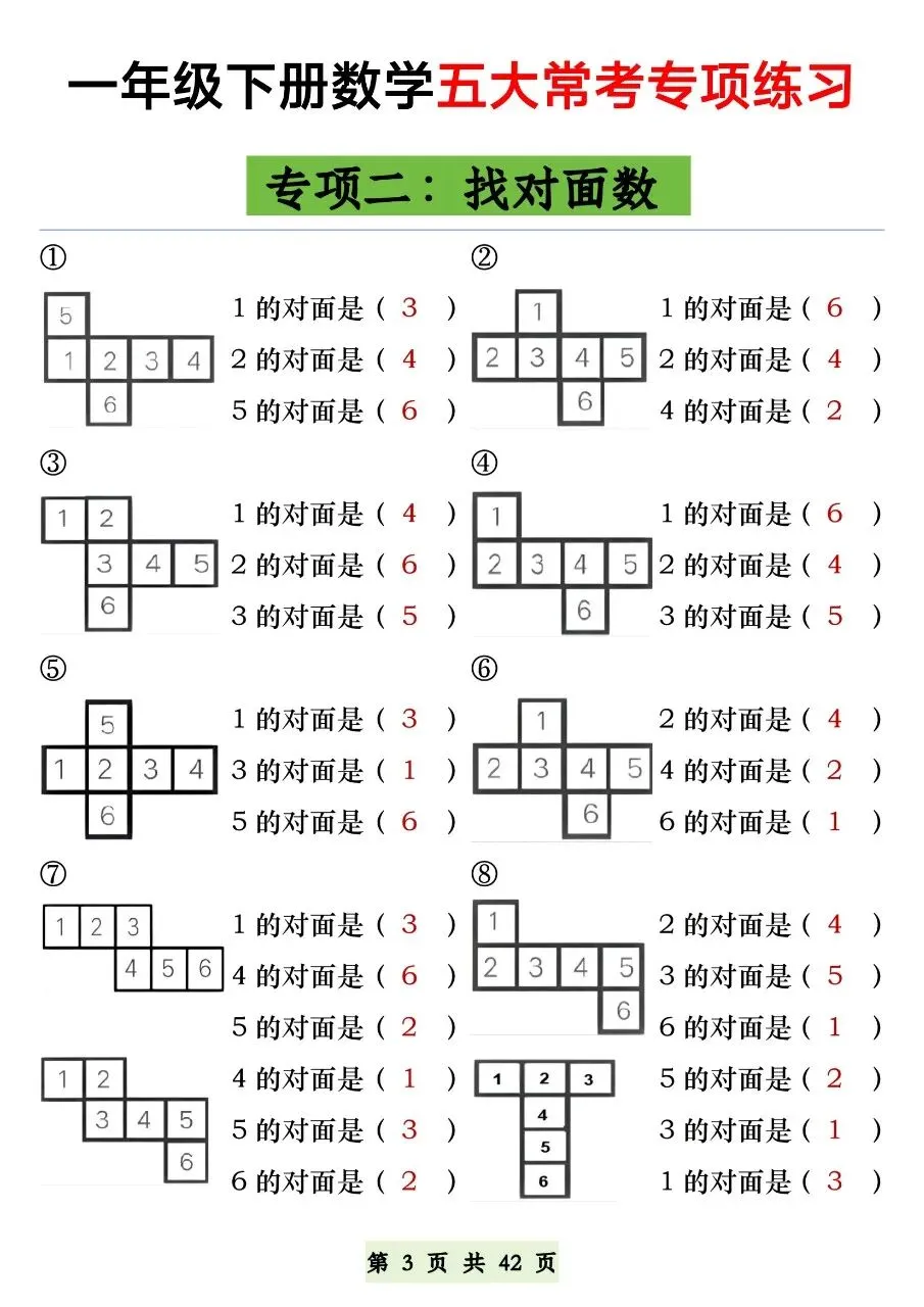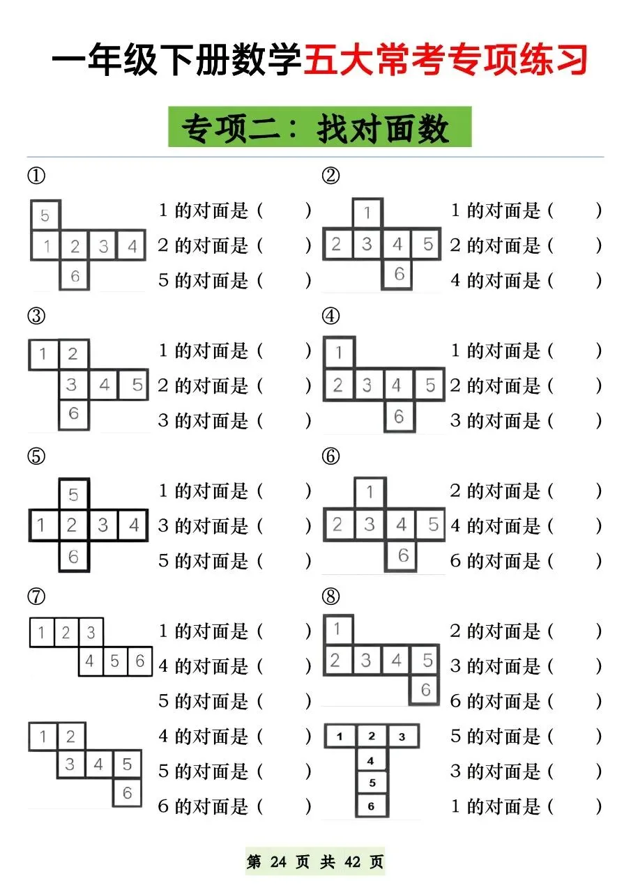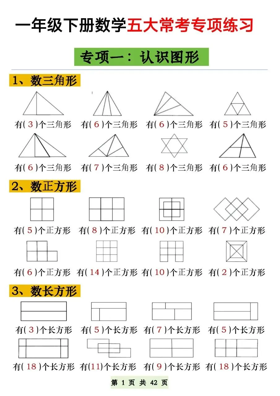 HI,今天分享的学习资料是:2026年春一年级下册数学通用版《五大常考题型》专项练习(含答案),高清完整电子版可打印。这份资料练图形计数、正方体对面、补砖、百数表、数的认识,都是必考易错点,建议打印出来让孩子专项练一练,打牢基础,助力考试取得好成绩吧!🌸欢迎分享到家长群或班级群,帮助更多孩子高效学习吧~