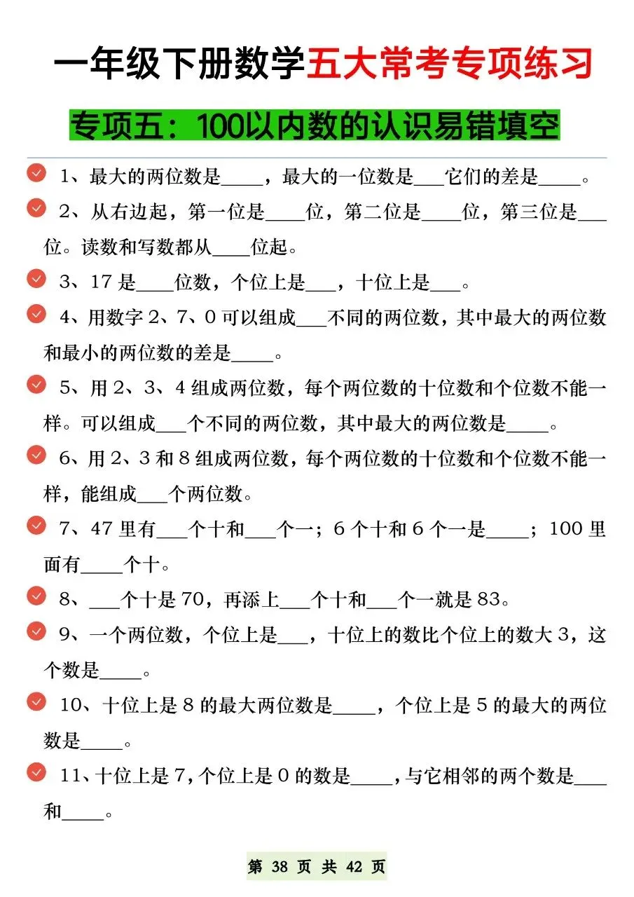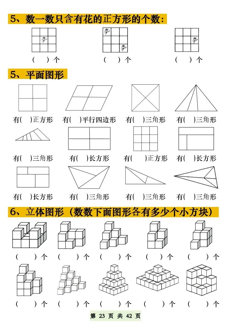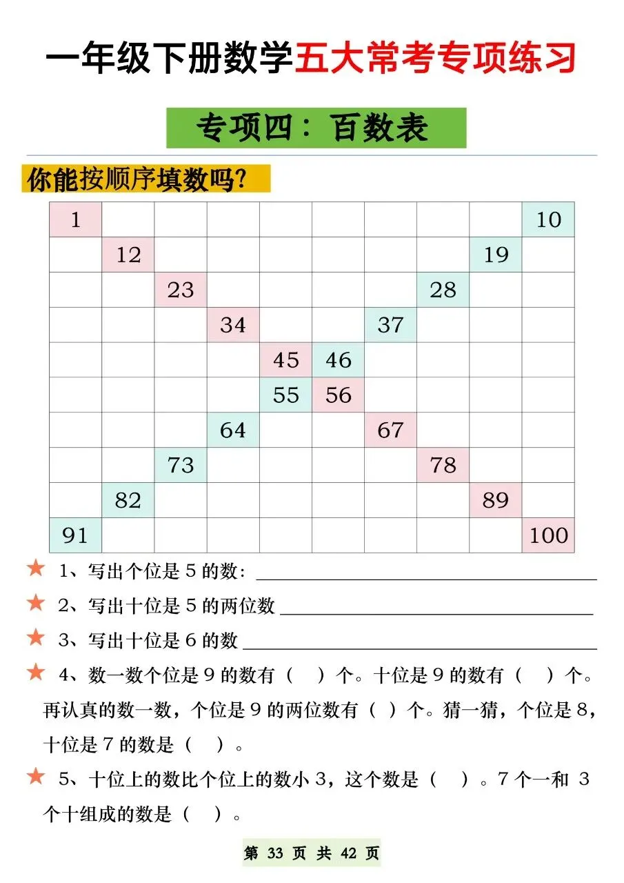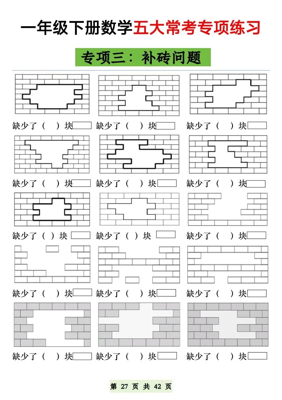 HI,今天分享的学习资料是:2026年春一年级下册数学通用版《五大常考题型》专项练习(含答案),高清完整电子版可打印。这份资料练图形计数、正方体对面、补砖、百数表、数的认识,都是必考易错点,建议打印出来让孩子专项练一练,打牢基础,助力考试取得好成绩吧!🌸欢迎分享到家长群或班级群,帮助更多孩子高效学习吧~