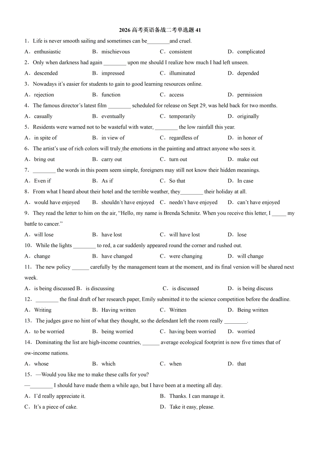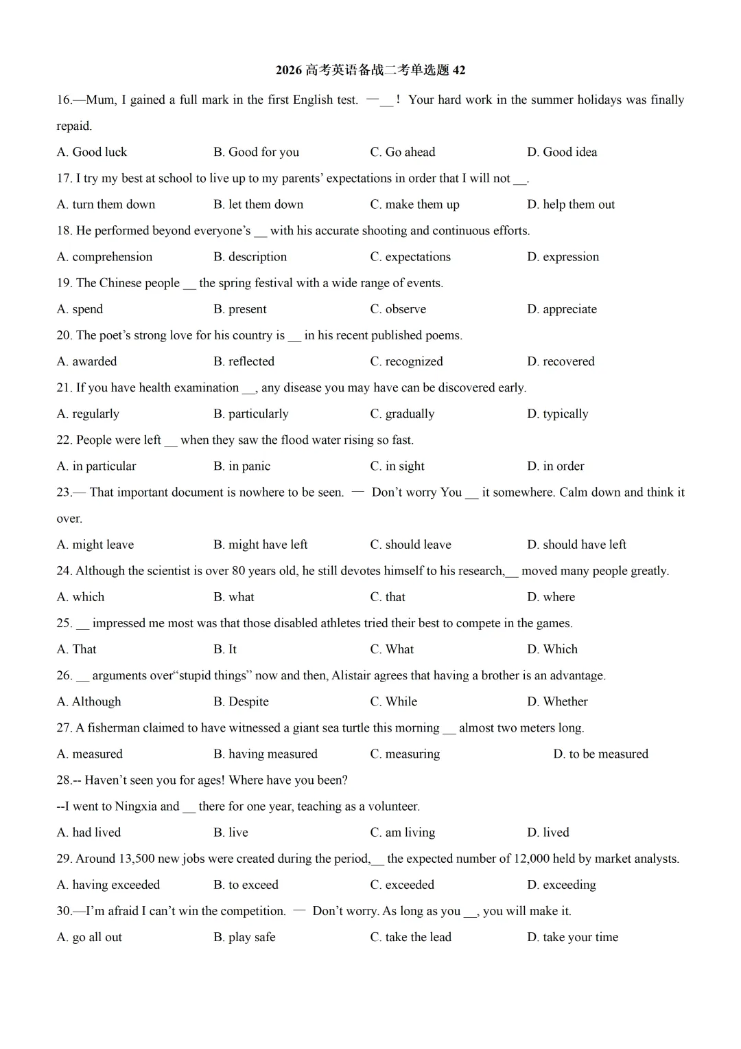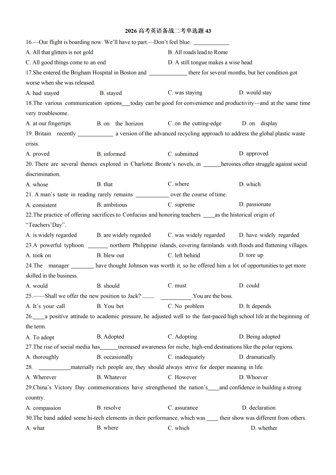 【可下载】2026届高三英语单选题10套专项训练五(150题)点击上方“蓝字”免费关注!完整版试卷+答案下载入口关注“卿卿侃古今”公众号点击左下角阅读原文可下载相关链接:2007-2025年天津市高考英语真题汇总(持续更新中~)2011-2023年天津高考英语听力真题在线测试【高考英语听力在线测试】高考听力机考模拟试题大全(持续更新中)【可下载】2025-2026年高中英语试题汇总(附解析)【持续更新中】【汇总】高中英语月考和期中期末试题(持续更新中~)【题库】高一英语试题汇编(持续更新中~)【题库】高二英语试题汇编(持续更新中~)【题库】高三英语试题汇编(持续更新中~)【可下载】高三英语上学期期末试题16套(附解析)【可下载】高二英语上学期期末试题10套(附解析)【可下载】高一英语上学期期末试题汇9套(附解析)【可下载】2025-2026学年度高一高二高三开学考试模拟试卷(天津专用)(附解析)新外研版高中英语高清电子课本、课文原文和译文、单元同步复习资料和试题【持续更新中】【目录1】高中英语阅读理解限时训练大全(持续更新中~)【目录2】高中英语完形填空限时训练大全(持续更新中~)【目录3】高中英语书面表达大全(持续更新中~)【目录4】高中英语听力训练大全(持续更新中~)【目录5】高中英语单选题大全(持续更新中~)【目录6】高中英语语法题大全(持续更新中~)【目录7】高中英语阅读表达题大全(持续更新中~)【目录8】科普知识汇总【目录9】中高考学法知识汇总【目录10】高考英语真题+名校模拟真题+月考和期中期末试题(持续更新中~)【目录11】暑期高考英语备考资料大全持续更新中~【汇总】中高考志愿填报资料大全【汇总】高中英语月考和期中期末试题(持续更新中~)【汇总】2026届高三英语一模试题(附解析)【汇总】2025届高三英语一模试题(附解析)【汇总】2025届高三英语二模试题(附解析)【汇总】2025届高三英语三模试题(附解析)【汇总】2024届高三英语一模二模三模试题(附解析)【汇总】2024届高考英语押题卷(附解析)【汇总】2025届高三英语周考综合练(附解析)【题库】高三英语限时训练(持续更新中~)【模拟】2025届高三英语听力机考模拟试题在线测试【高考词汇】(新)外研版高中英语全七册词汇表(附音频)【中考词汇】初中英语外研版必备单词表(完整版),可打印 建议收藏保存点击阅读原文查更多