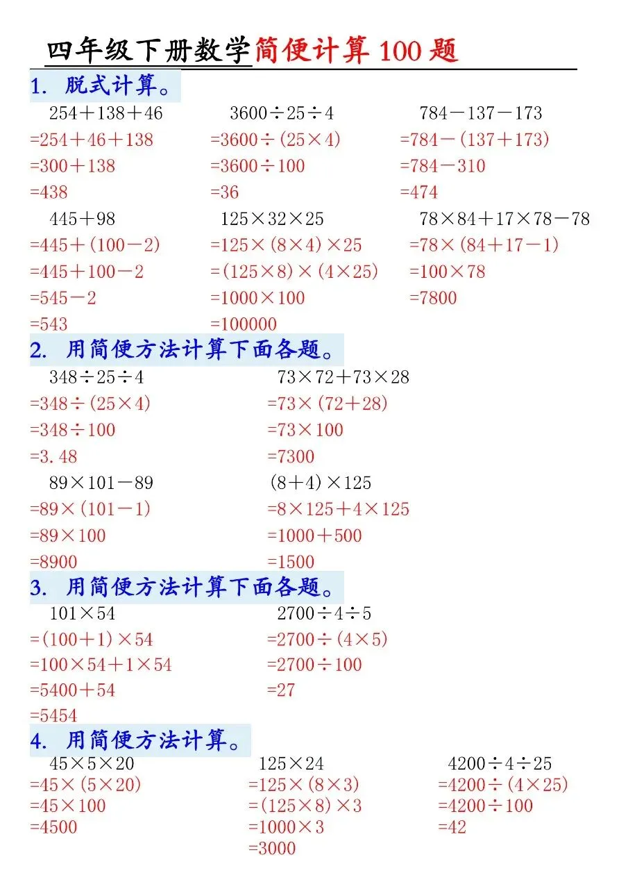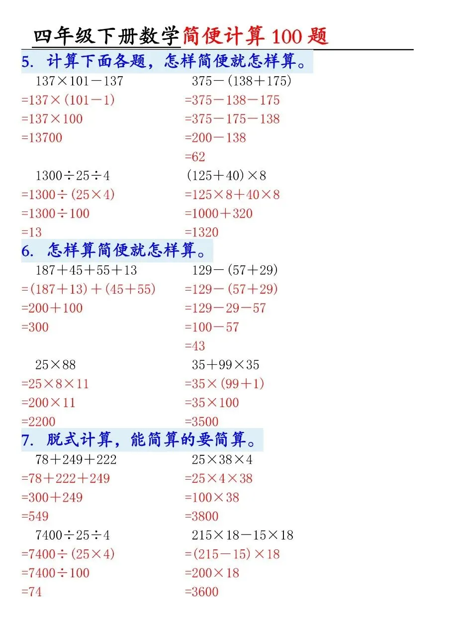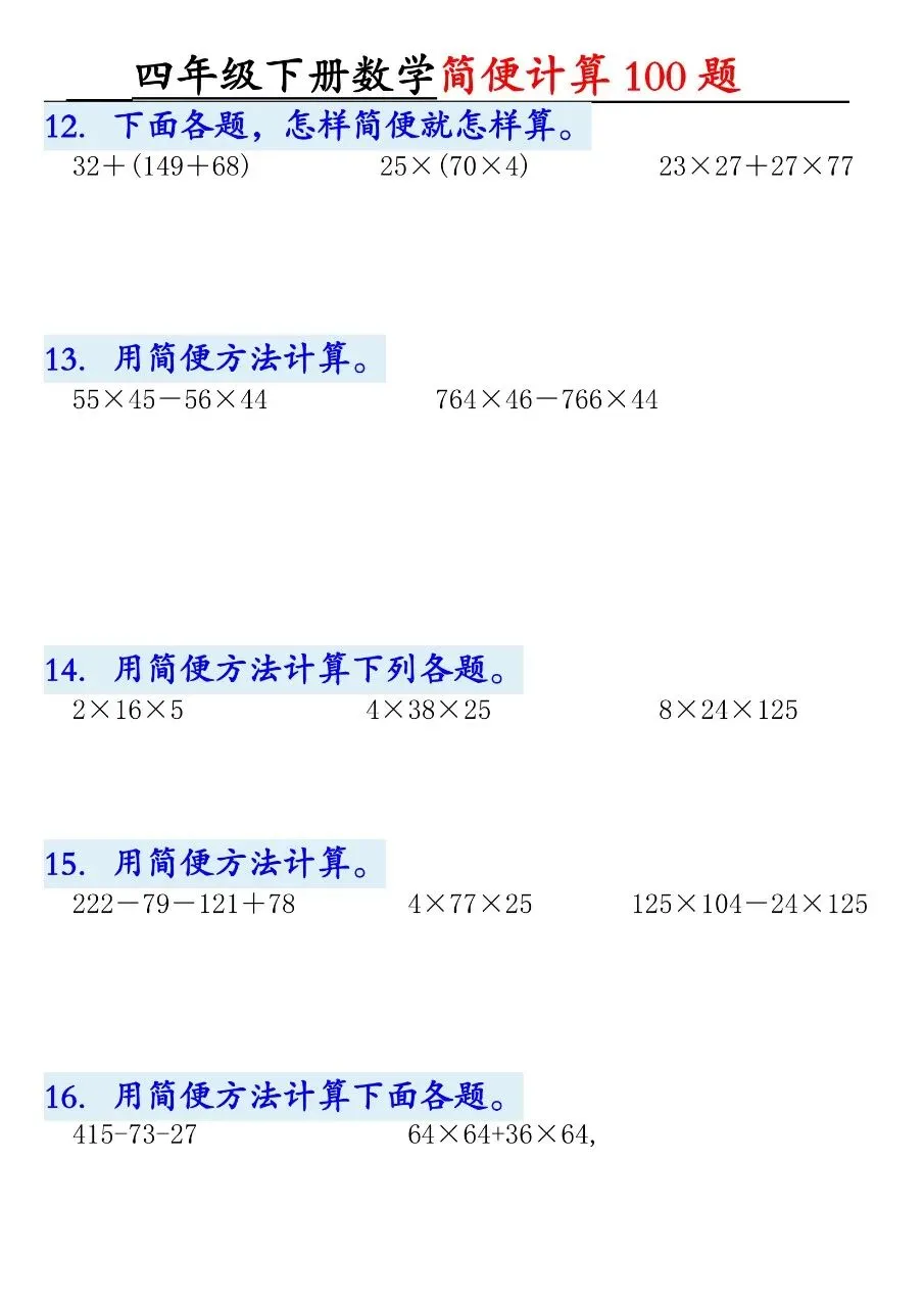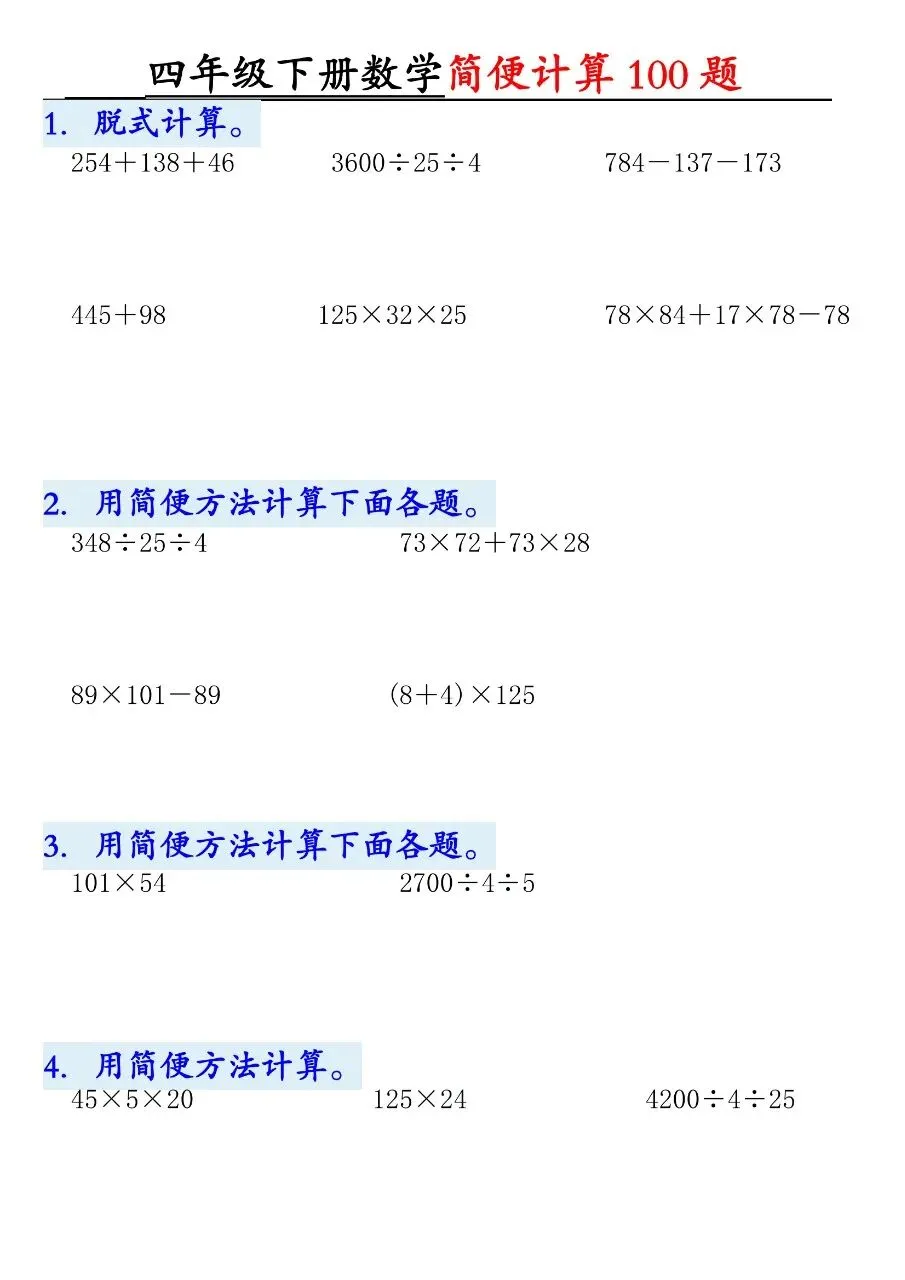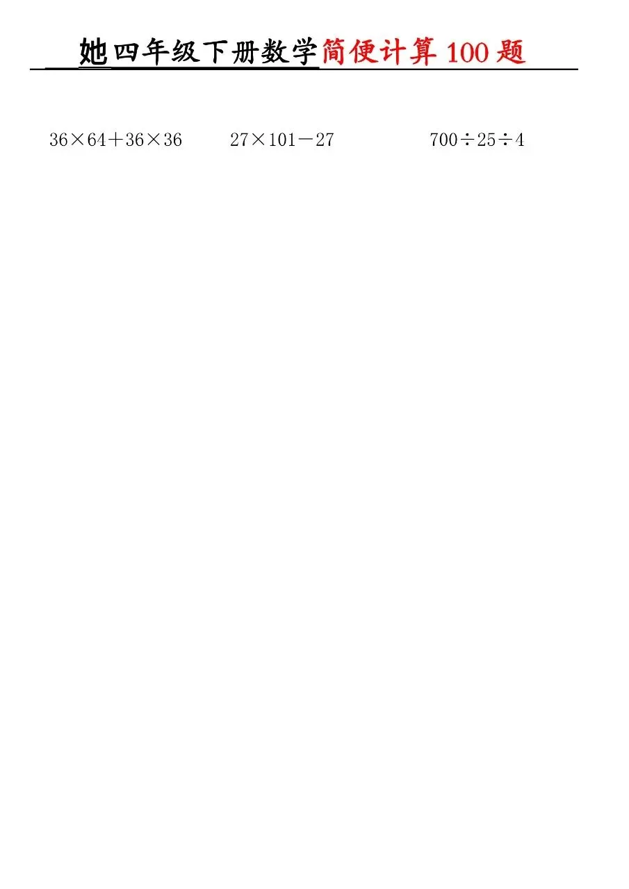 HI,今天分享的学习资料是:2026年春四年级下册数学通用版《简便运算·计算100题》专项练习(含答案),高清完整电子版可打印。这份资料核心是用加法交换律、结合律,乘法分配律、结合律,连减连除性质简算。建议打印出来让孩子专项练一练,提升计算准确率和速度,助力考试取得好成绩吧!🌸欢迎分享到家长群或班级群,帮助更多孩子高效学习吧~