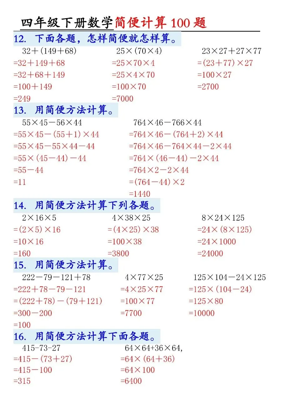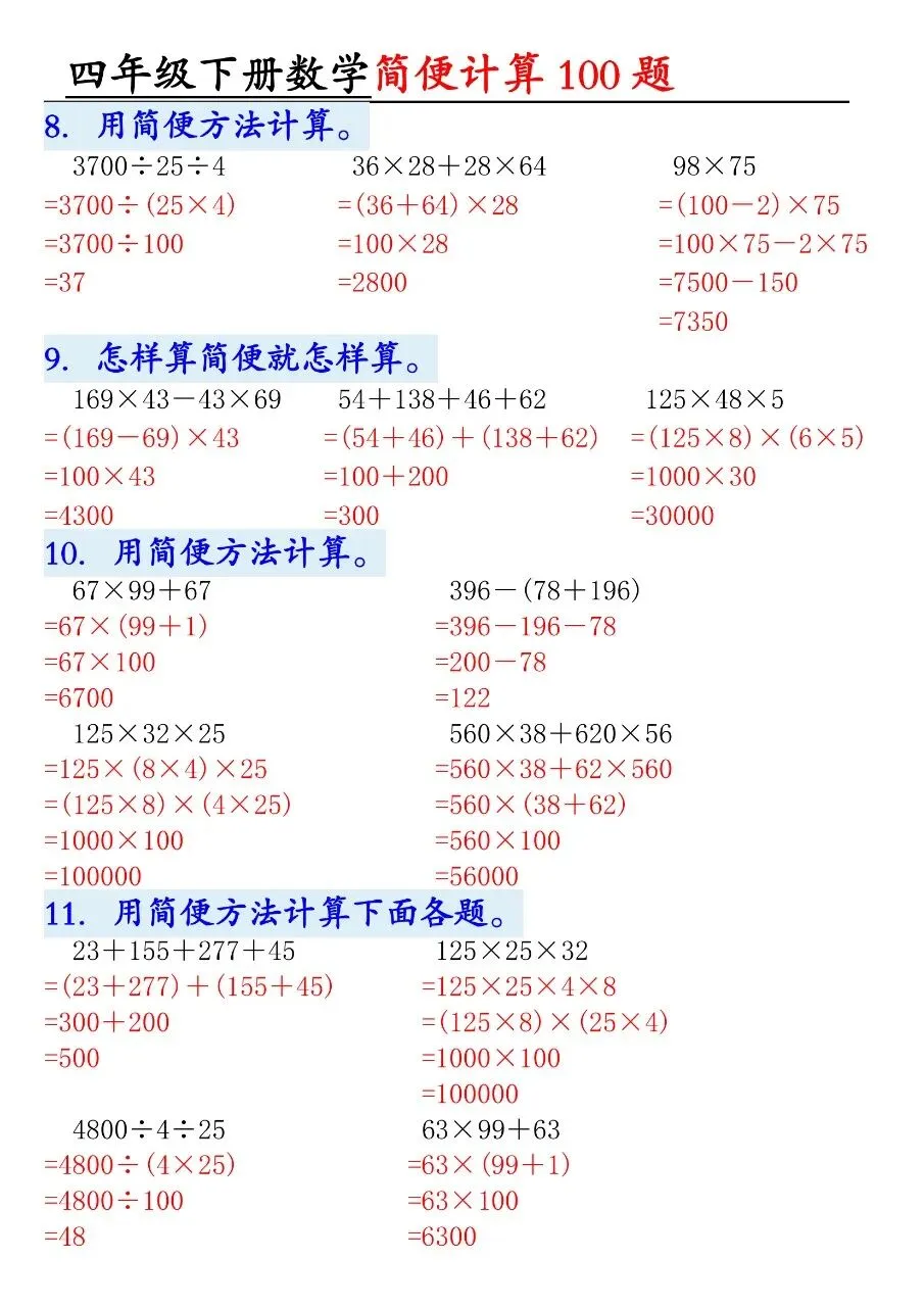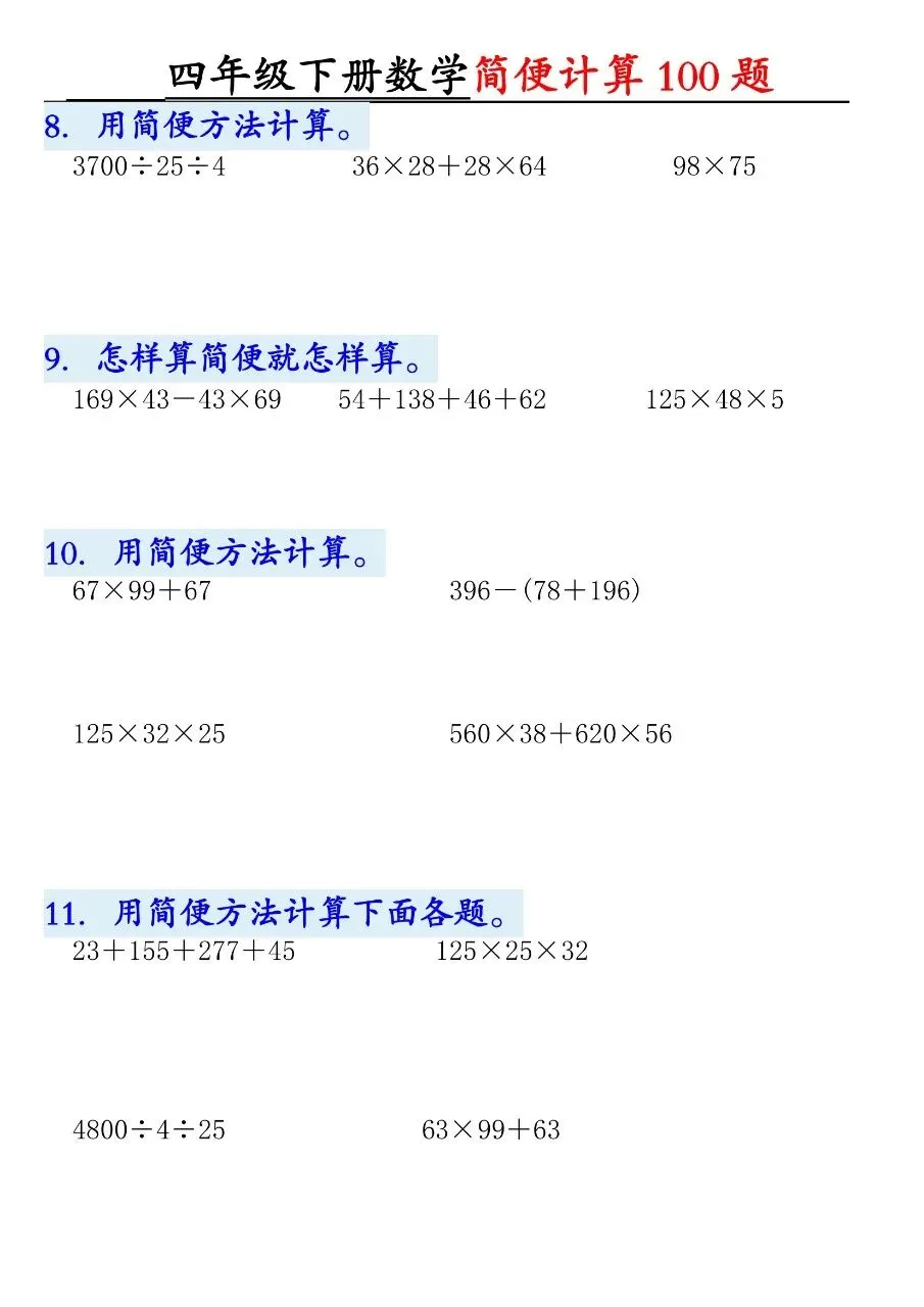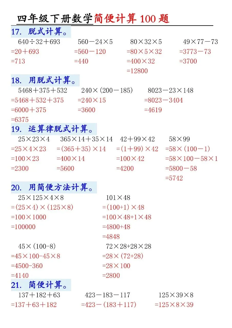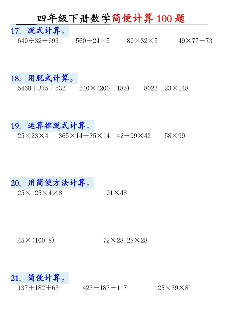 HI,今天分享的学习资料是:2026年春四年级下册数学通用版《简便运算·计算100题》专项练习(含答案),高清完整电子版可打印。这份资料核心是用加法交换律、结合律,乘法分配律、结合律,连减连除性质简算。建议打印出来让孩子专项练一练,提升计算准确率和速度,助力考试取得好成绩吧!🌸欢迎分享到家长群或班级群,帮助更多孩子高效学习吧~