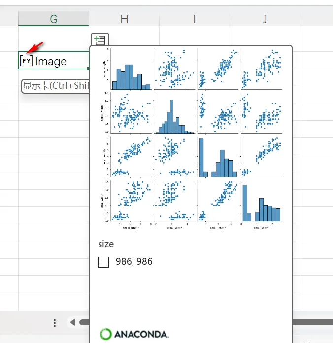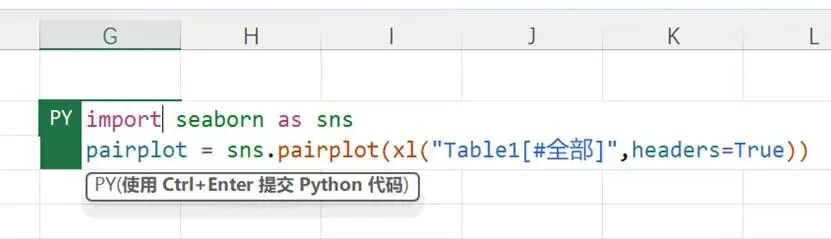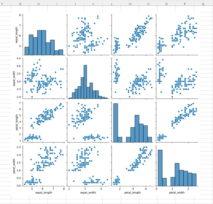 代码中,首先使用import语句导入seaborn库,然后使用该库函数pairplot创建配对图表。注意到,使用xl()函数引用工作表中名为“Table1”的表(即鸢尾花数据集)。