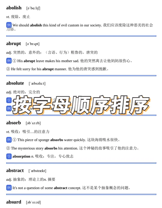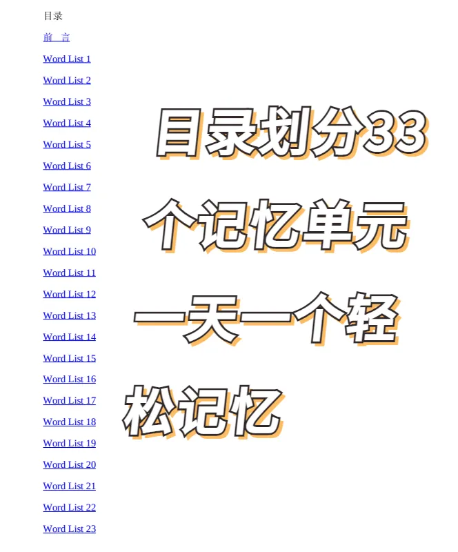全书一共 33 个 Word List,按字母顺序科学排版,难度循序渐进,不混乱、不跳级。