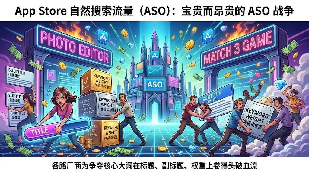 在出海买量圈,所有人都知道 App Store 的自然搜索流量(ASO)极其宝贵,但也极其昂贵。为了争夺“Photo Editor”或者“Match 3 Game”这样的核心大词,各路厂商在标题、副标题、关键词权重上卷得头破血流。