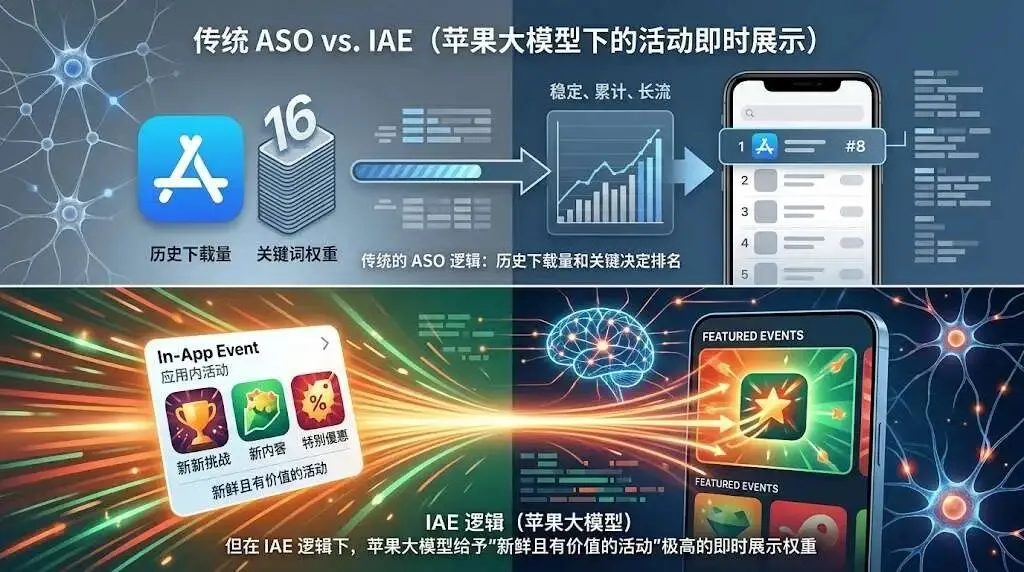 在传统的 ASO 逻辑中,你的排名是由历史下载量和关键词权重决定的。但在 IAE 的逻辑下,苹果大模型给予了“新鲜且有价值的活动”极高的即时展示权重。