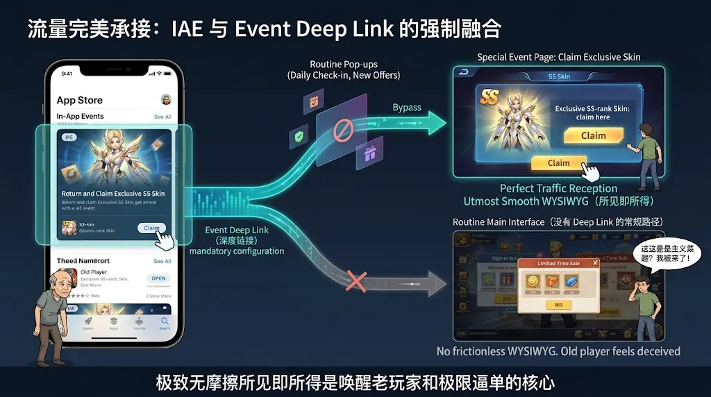 当一个老玩家在商店看到了“回归领取绝版 SS 级皮肤”的 IAE 卡片,点击打开游戏后,如果面对的是一个极其常规的主界面,他会觉得被骗了。 配置 IAE 时,强制要求填入 Event Deep Link (深度链接)! 当用户点击活动卡片启动 App 时,你的技术底层必须极其丝滑地绕过所有的常规弹窗,直接将用户“瞬移”到那个领取绝版皮肤的特定活动页面。这种毫无摩擦力、极致顺滑的所见即所得,不仅是苹果审核过关的硬性条件,更是你完成唤醒老玩家和极限逼单的关键!