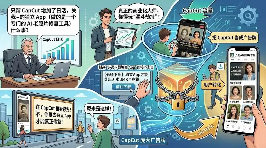 很多老板会问:这只是帮 CapCut 增加了日活,关我的独立 App(比如我做的是一个专门的 AI 老照片修复工具)什么事? 真正的商业化大师,懂得如何玩“漏斗劫持”。