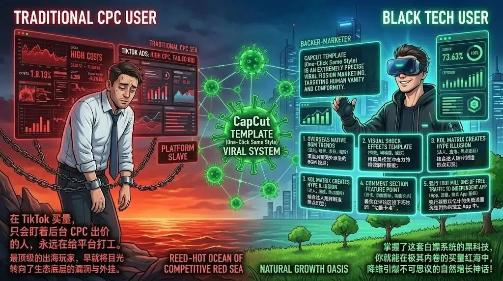当 TikTok 上的短视频与 CapCut 模板底层打通的那一刻,一套极其恐怖的、自带病毒传播属性的自然裂变黑科技就此诞生。今天,我们将深度解剖这套白嫖全网数亿次曝光的裂变引擎,教你如何用极低的模板成本,引爆你的 App 下载量!