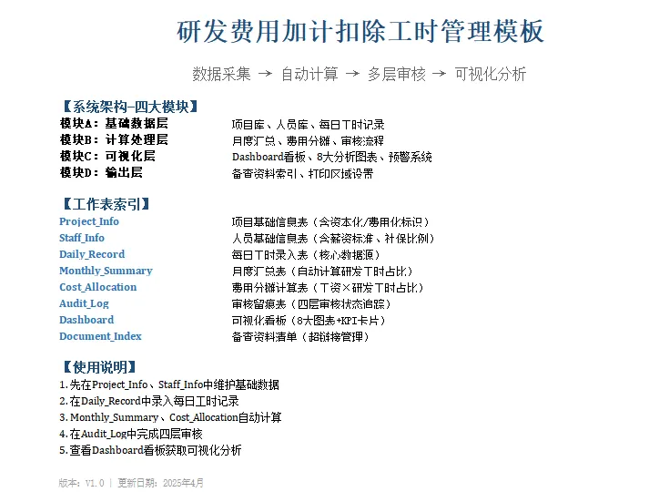 为了解决这一难题,我们自行设计并逐步完善《研发费用加计扣除工时管理模板【自动化版】》,实现“每日记录、自动汇总、一键分摊、多层审核、可视分析”的全流程数字化管理。