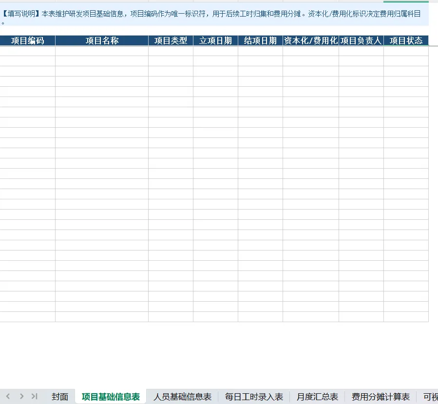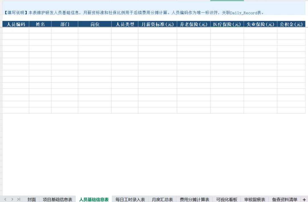 包含项目库(Project_Info)和人员库(Staff_Info)。项目需标注资本化/费用化标识,人员需录入月薪资标准及社保公积金金额。这是所有计算的基石。