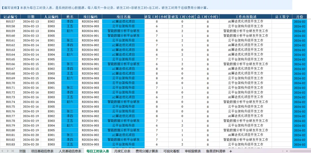 每人每天记录研发工时(6-8小时不等)和非研发工时(0-2小时)