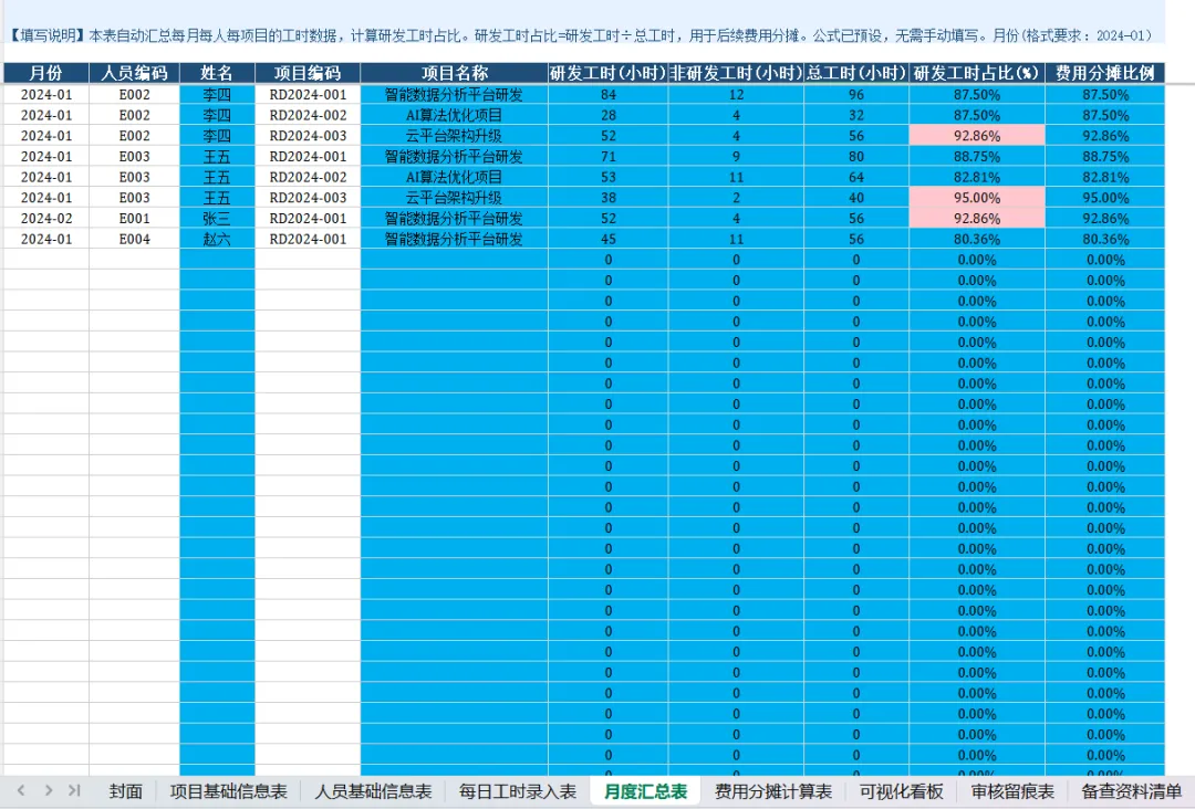 月度汇总表(Monthly_Summary):自动按“月份-人员-项目”维度汇总工时,并计算研发工时占比。