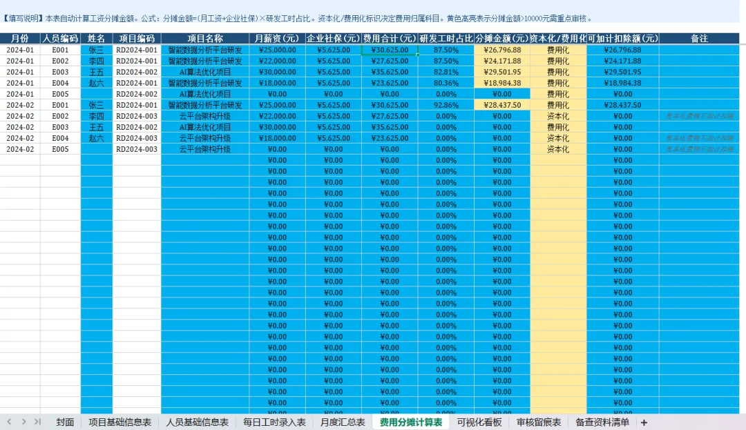 费用分摊计算表(Cost_Allocation):自动关联人员薪资、社保,乘以研发工时占比,得到应分摊至具体项目的金额,并自动判断“可加计扣除额”。