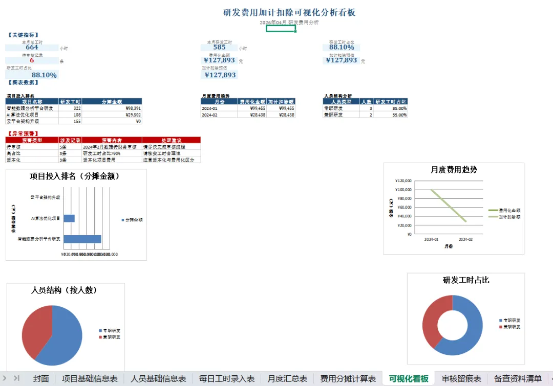 Dashboard看板自动生成8大分析图表,包括:项目投入排名、月度费用趋势、人员结构分析、关键KPI指标(总工时、研发工时占比、加计扣除预估等),并设有异常预警(如待审核记录、研发工时占比>90%等)。