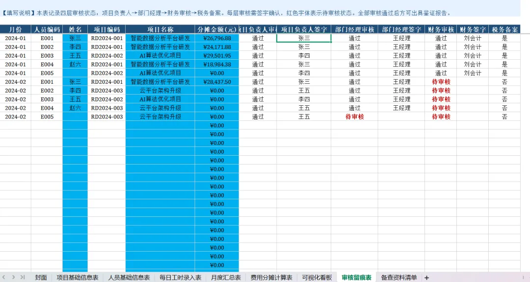 审核留痕表(Audit_Log):记录“项目负责人→部门经理→财务审核→税务备案”四层审核状态,确保每笔费用可追溯。