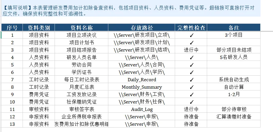 备查资料清单(Document_Index):超链接管理所有电子资料(立项决议、合同、凭证等),满足税务备查要求。