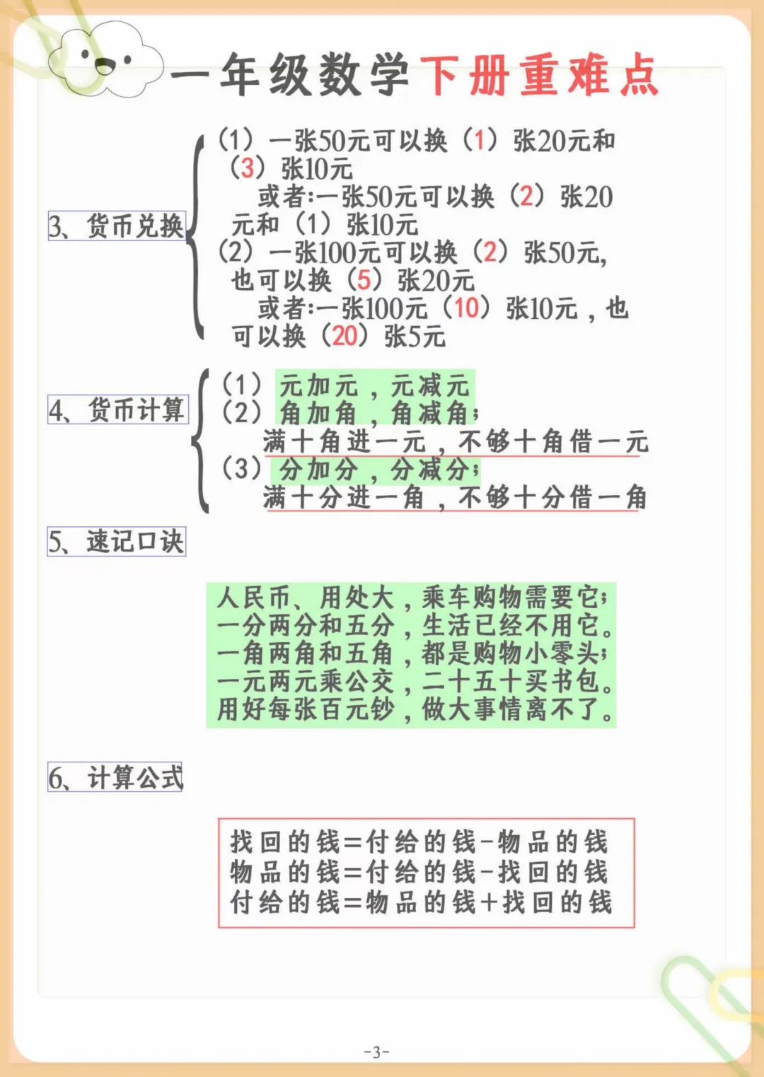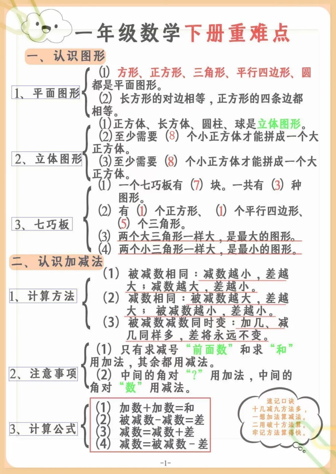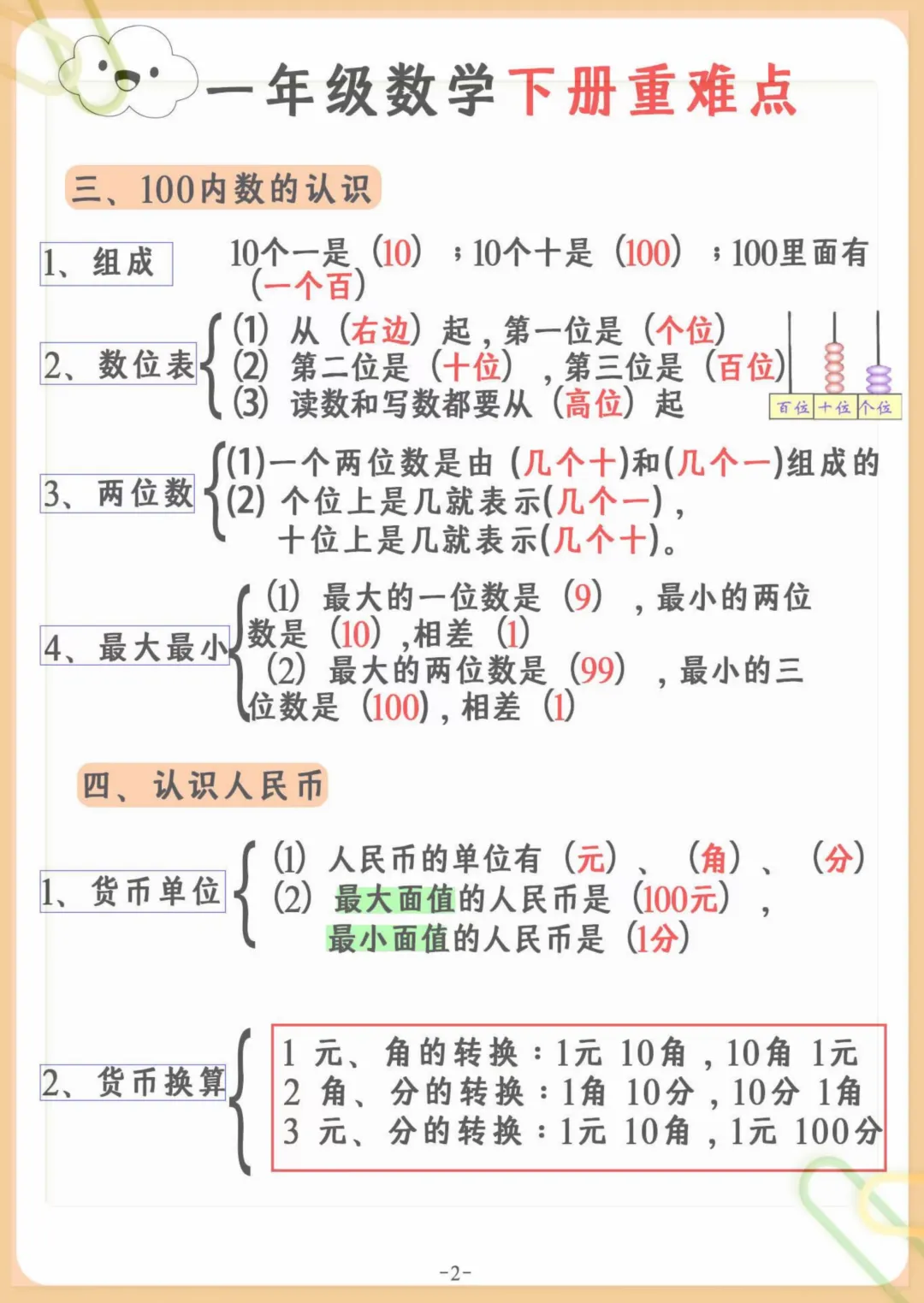 一年级下数学重难点汇总,共3页,电子版可下载可打印,这份资料围绕一年级下册数学学习中的重点、难点内容进行整理,涵盖多个核心知识点与专项训练内容,方便家长帮助孩子及时梳理课内所学、查漏补缺,也更适合作为日常复习和阶段巩固使用。内容精炼实用,打印出来就能练,让孩子在反复巩固中把基础打得更扎实。