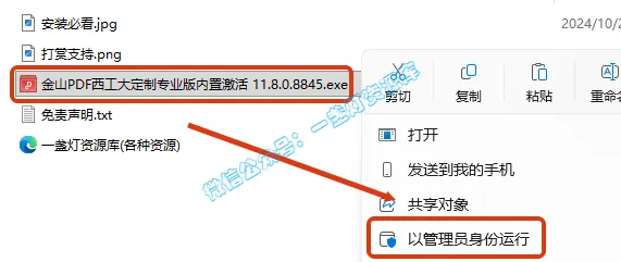 2.打开刚刚解压的文件夹,鼠标右键点击【金山PDF西工大定制专业版内置激活 11.8.0.8845.exe】选择【以管理员身份运行】
