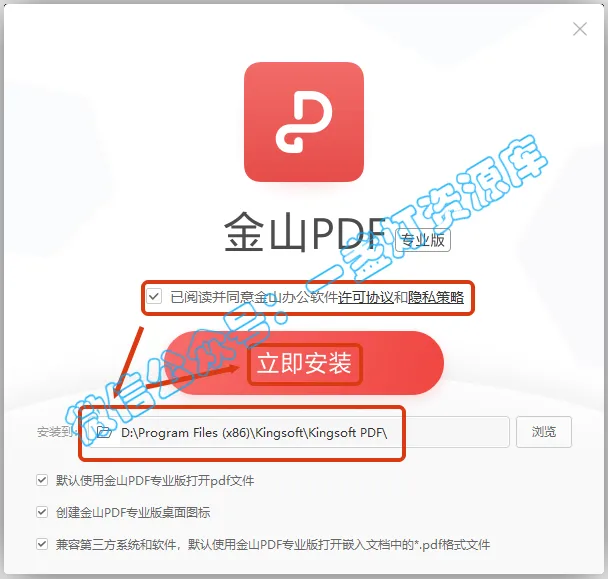 3.勾选【已阅读并同意金山办公软件许可协议和隐私政策】,更改安装路径,直接将首字母C改为D表示安装在D盘,路径不要出现中文,点击【立即安装】