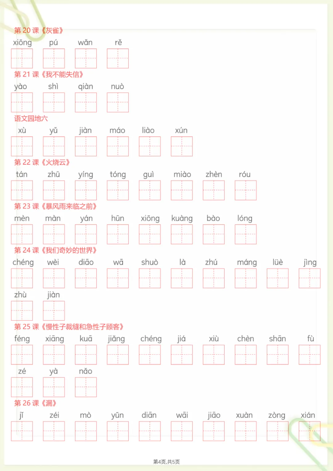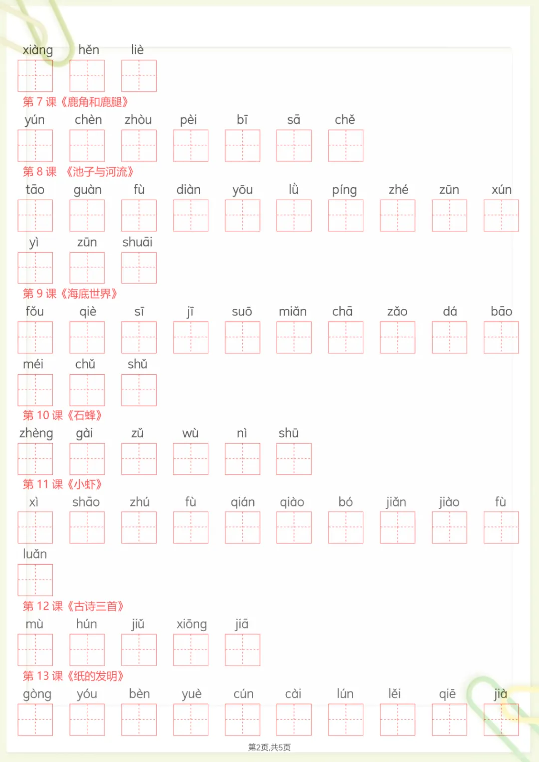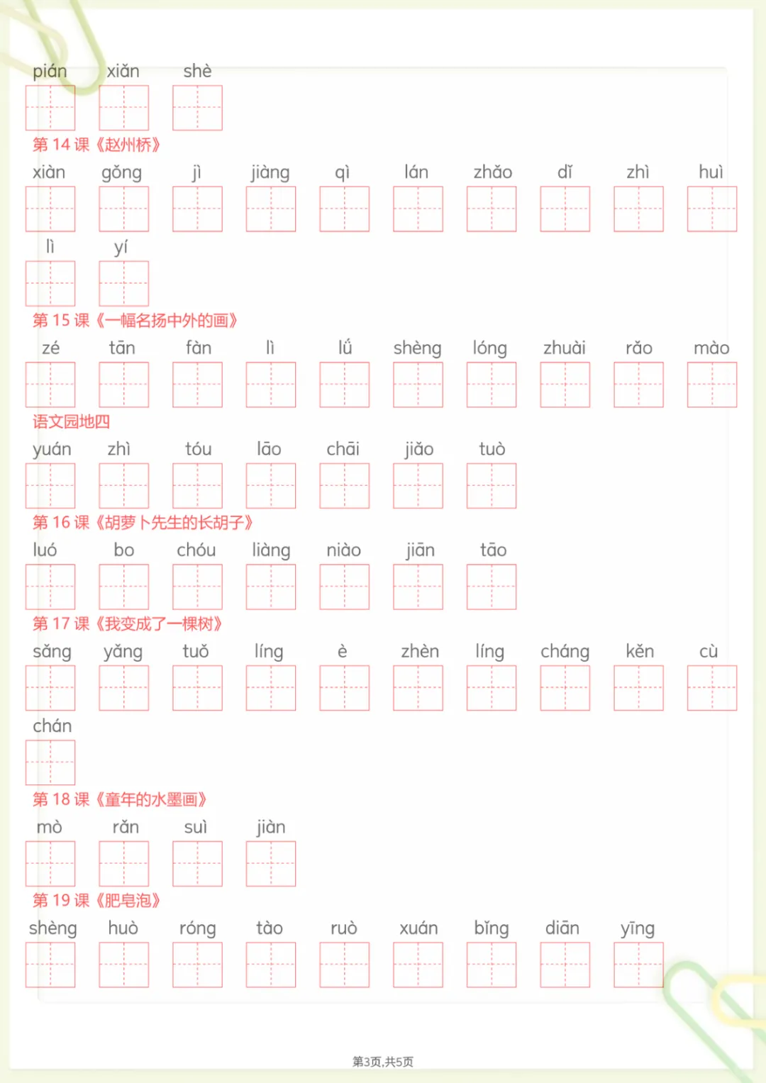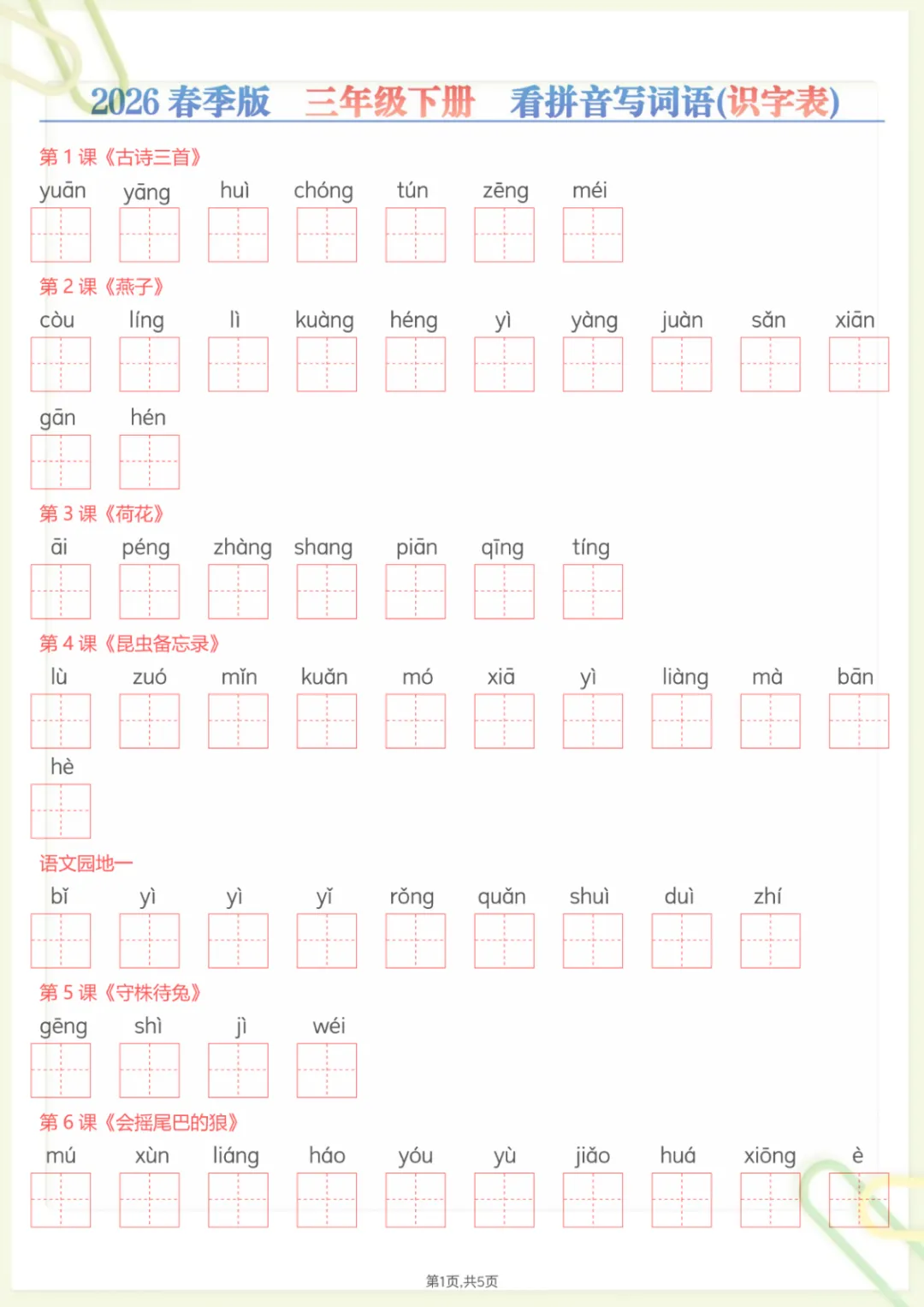 三年级下语文看拼音写词语—识字表,共10页,电子版可下载可打印,这份资料紧扣三年级下册语文基础字词学习,围绕看拼音写词语、识字认读与常用词语积累等内容进行练习,帮助孩子在日常巩固中提升拼读能力、书写能力和字词掌握效果,特别适合课后复习与阶段性查漏补缺。需要的家长可以及时下载打印出来,让孩子练一练,把基础打得更扎实。