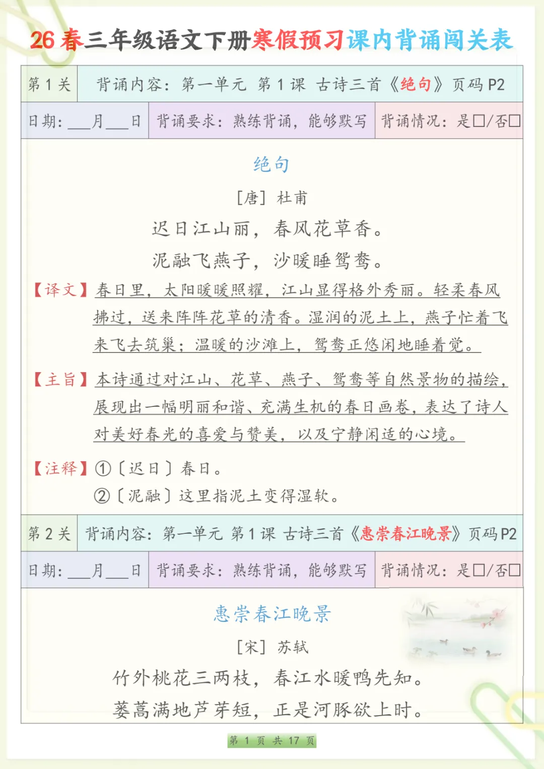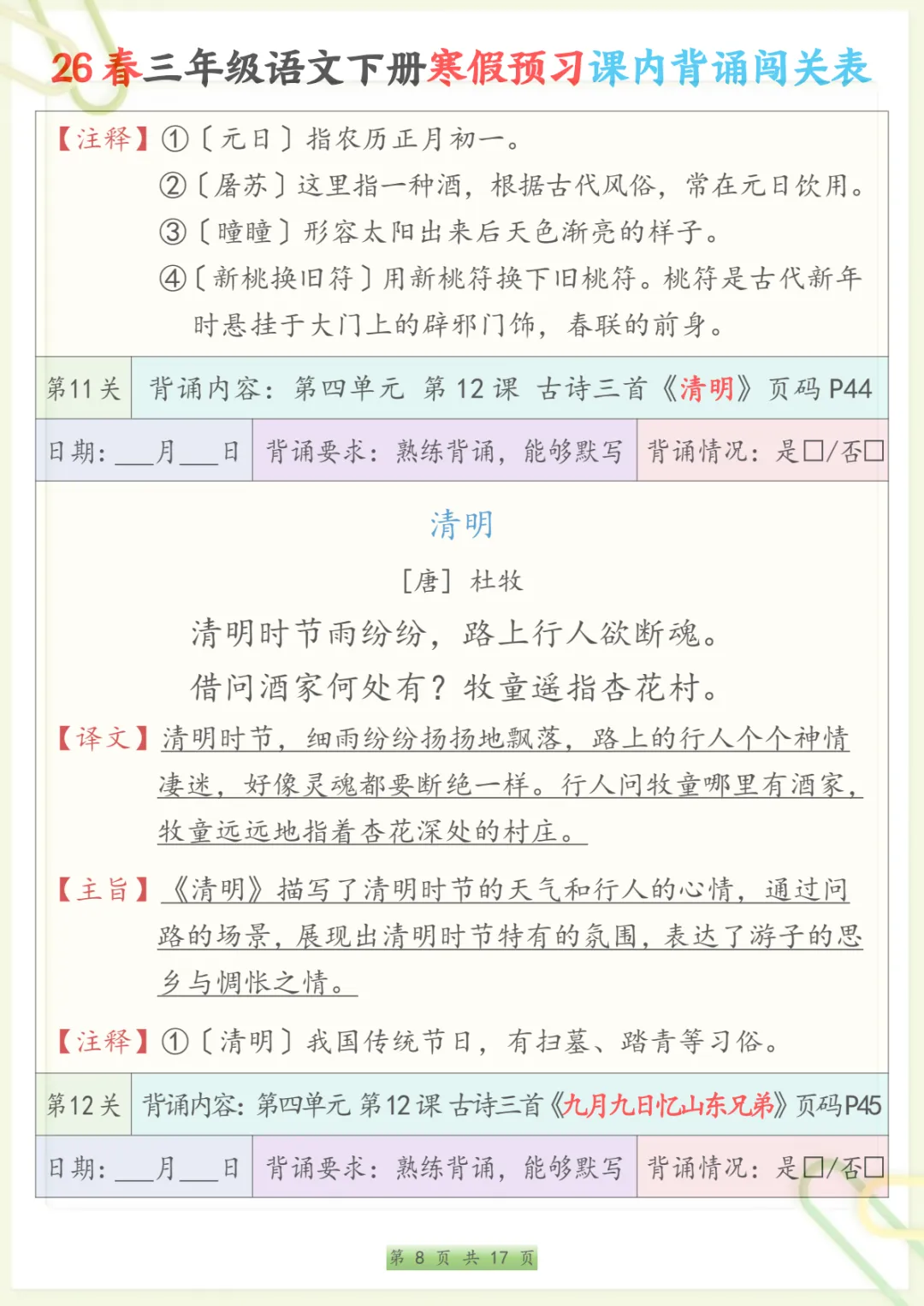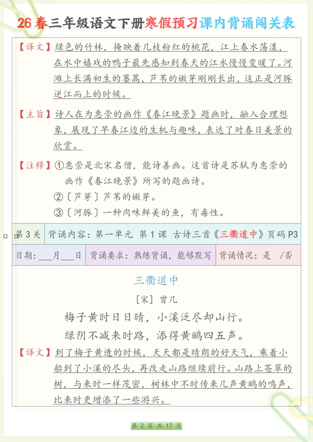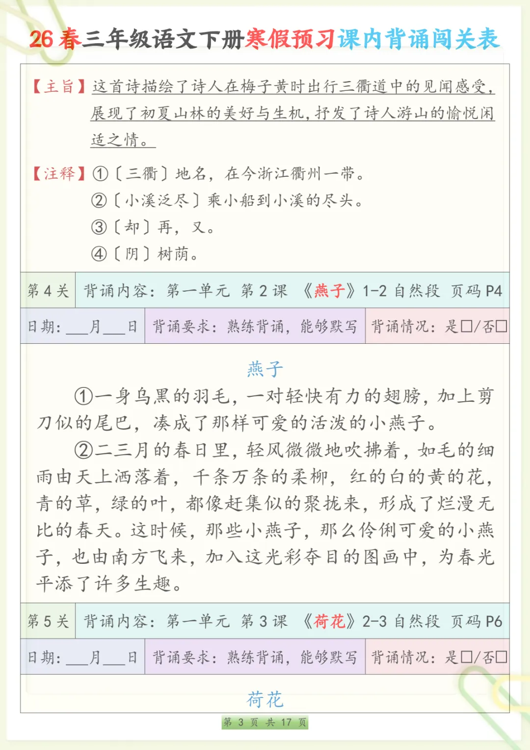 三年级下语文寒假预习课内背诵表,共17页,电子版可下载可打印,内容紧扣三年级下册语文课内背诵预习安排,方便家长提前帮助孩子熟悉新学期需要积累和背诵的重点内容,也有助于孩子在寒假阶段更有条理地进行语文预习与巩固,整体涵盖多个核心知识点与专项训练内容,适合作为开学前的语文准备资料。需要的家长可以抓紧下载打印出来,让孩子提前读一读、背一背。