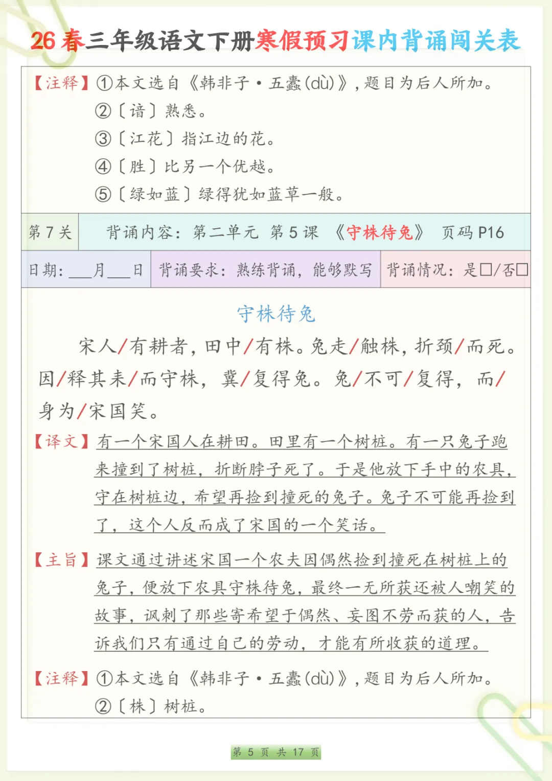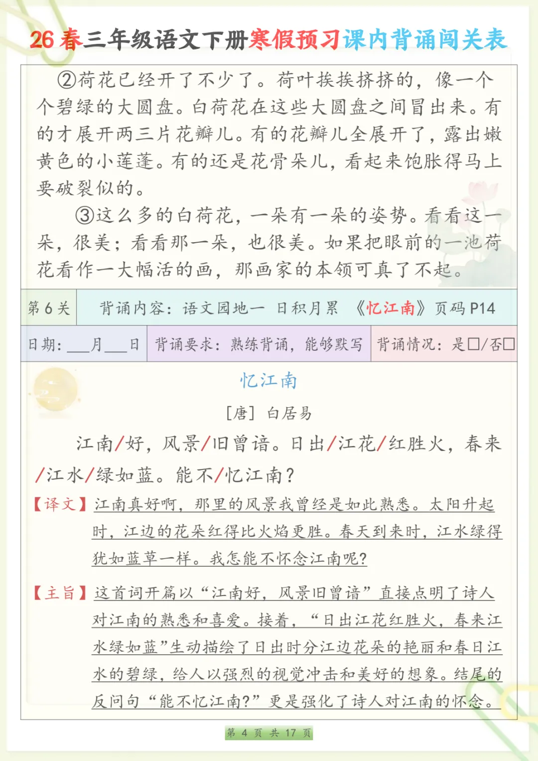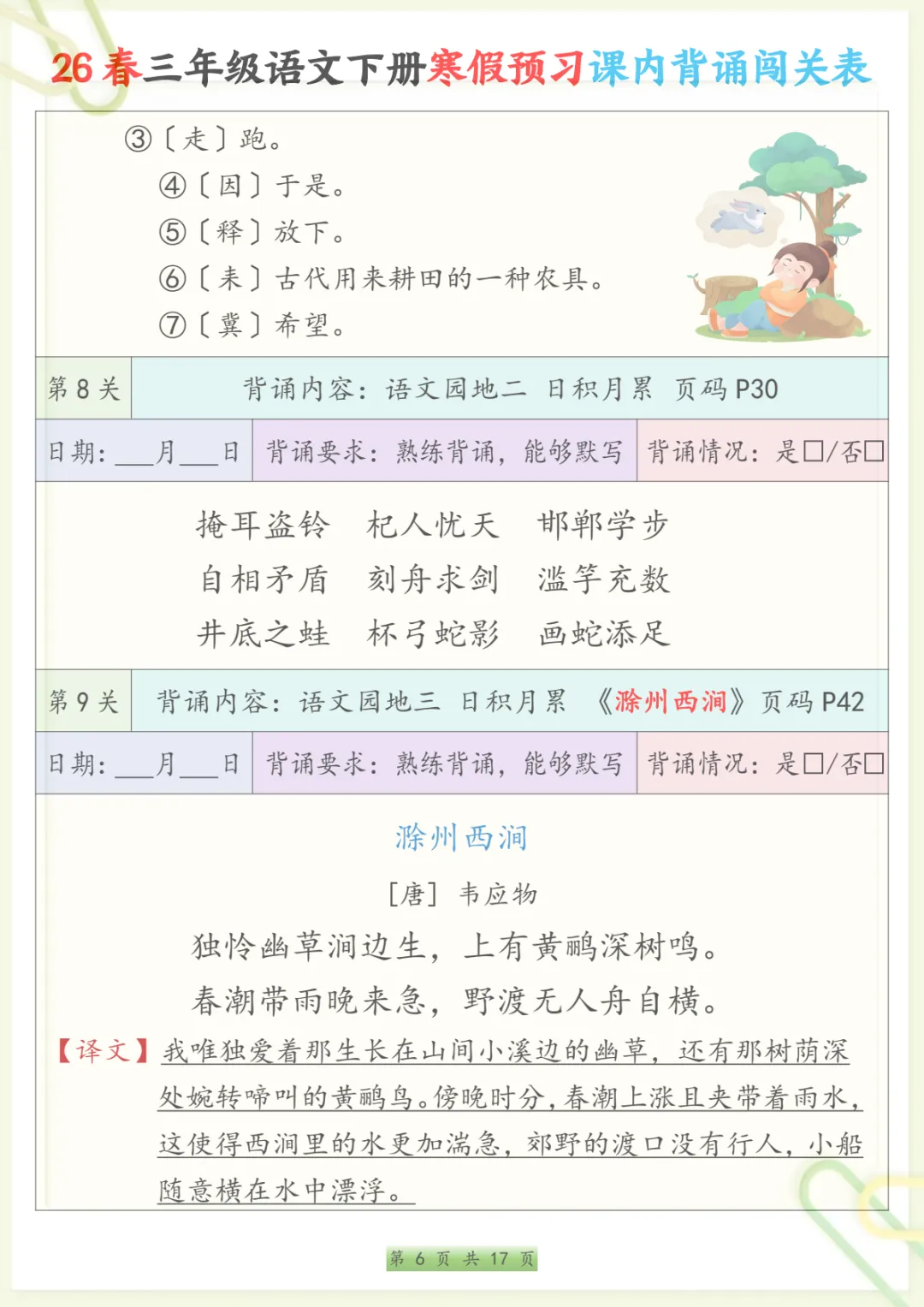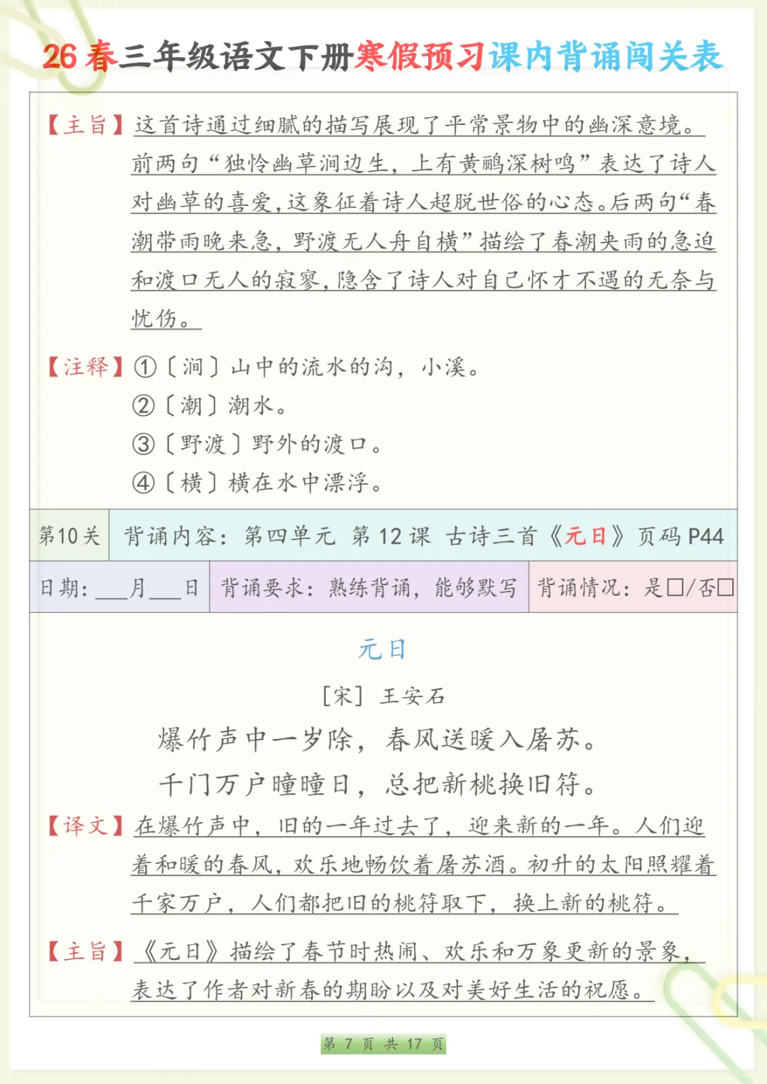 三年级下语文寒假预习课内背诵表,共17页,电子版可下载可打印,内容紧扣三年级下册语文课内背诵预习安排,方便家长提前帮助孩子熟悉新学期需要积累和背诵的重点内容,也有助于孩子在寒假阶段更有条理地进行语文预习与巩固,整体涵盖多个核心知识点与专项训练内容,适合作为开学前的语文准备资料。需要的家长可以抓紧下载打印出来,让孩子提前读一读、背一背。