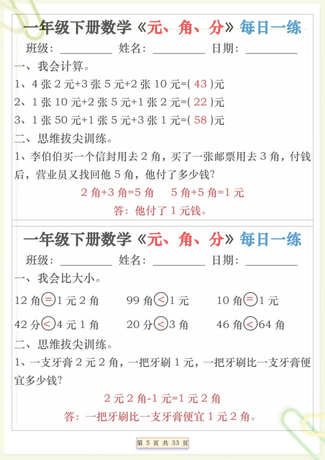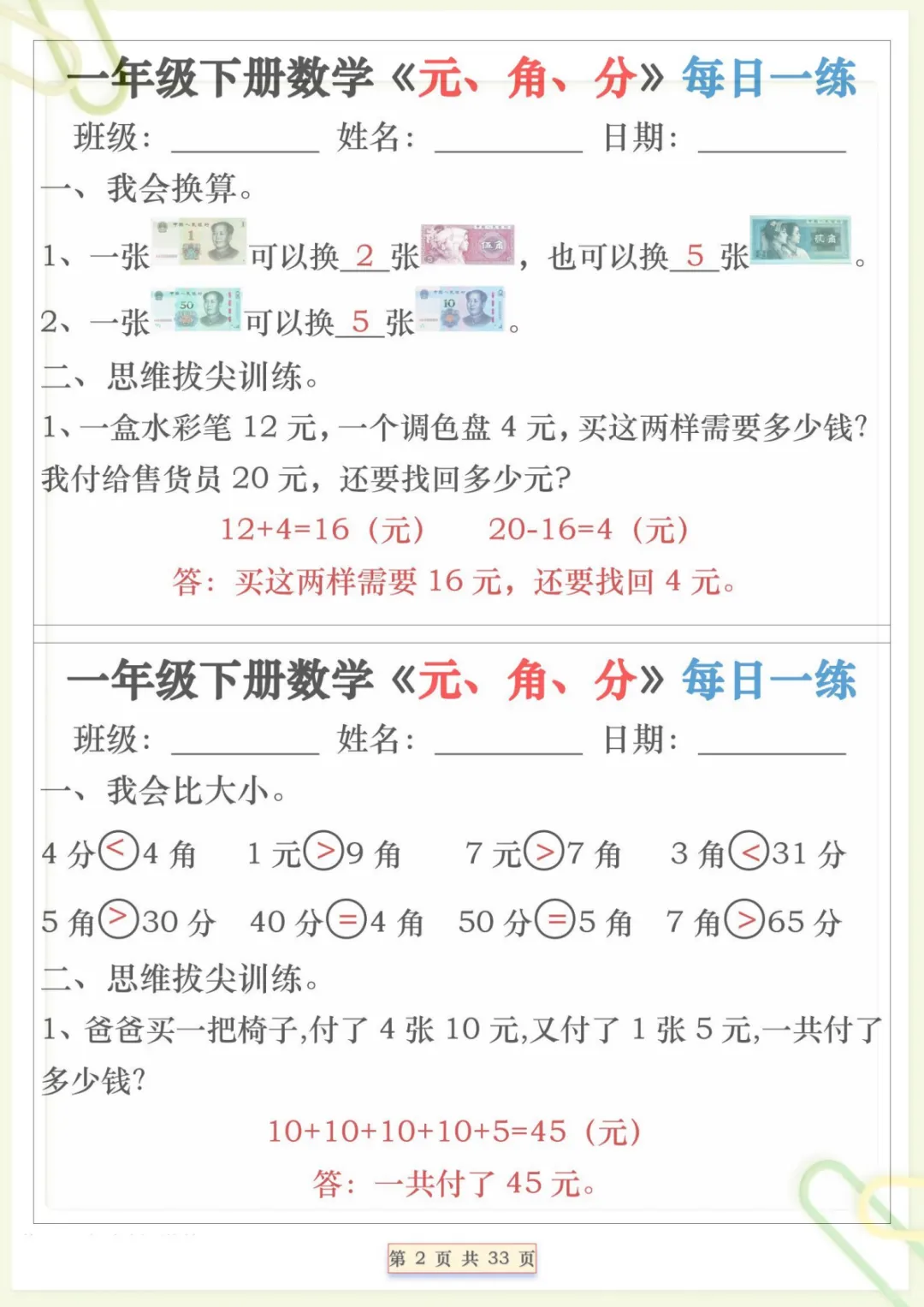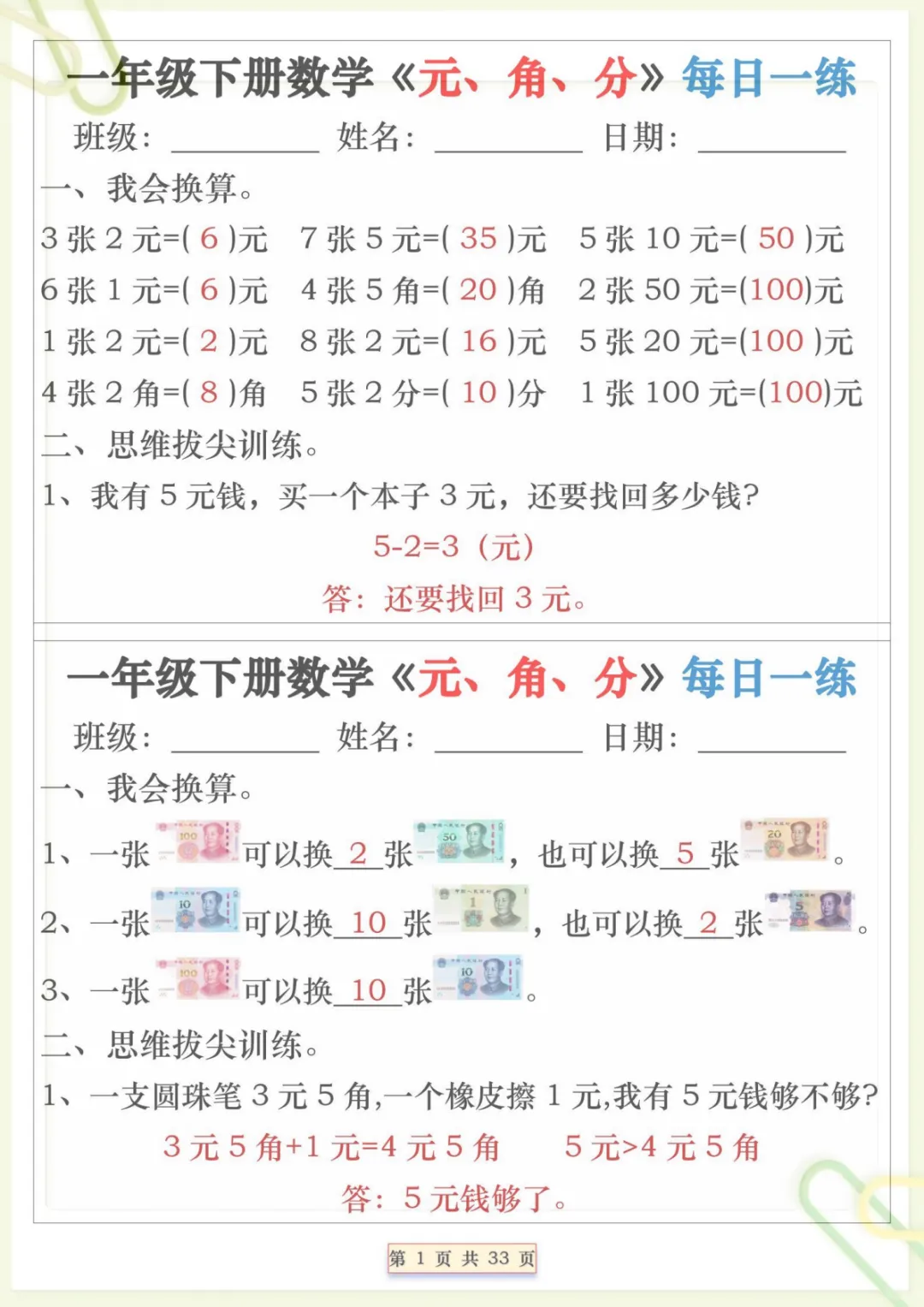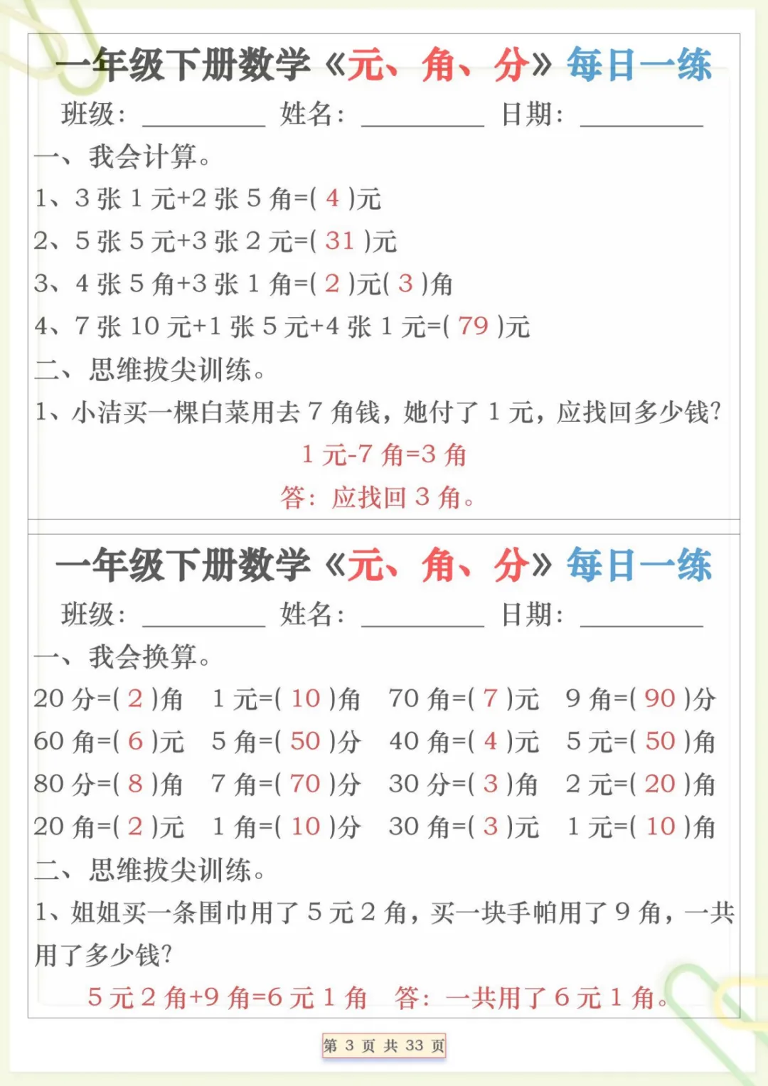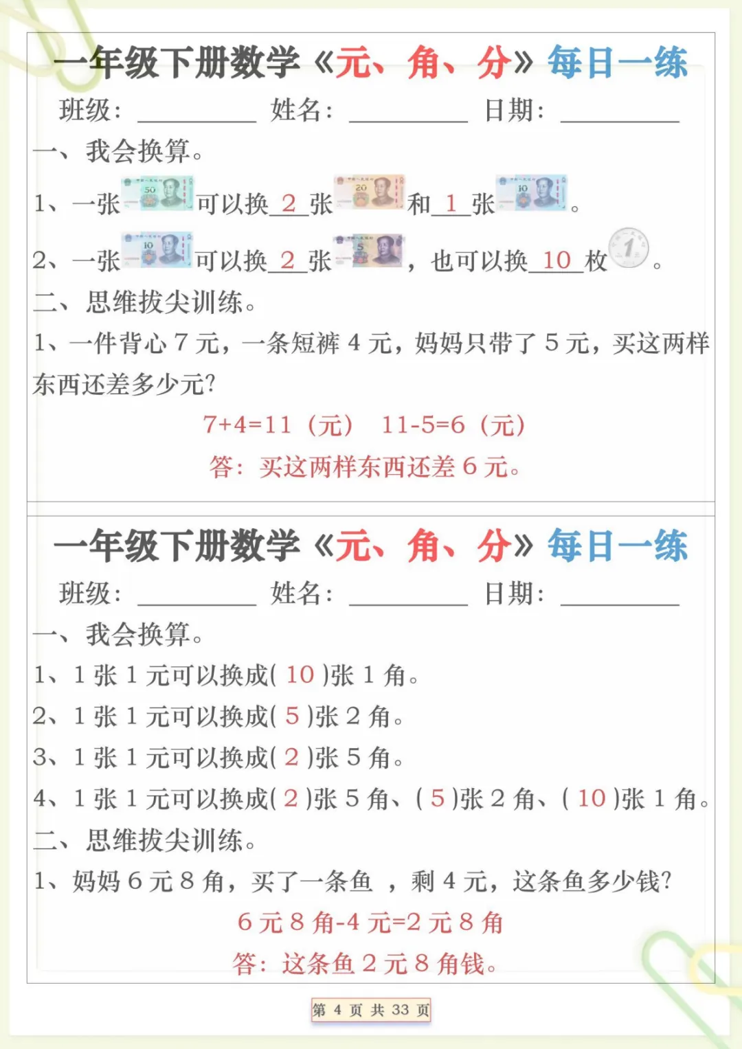 一年级下数学元角分专项每日一练,共32页,电子版可下载可打印,这份专项练习题围绕一年级下册数学中元、角、分的认识与应用展开,帮助孩子练习人民币单位换算、简单计算及生活情境中的实际运用,在每日巩固中逐步提升数学理解与解题能力,内容贴合课堂学习节奏,适合家长打印出来给孩子进行专项训练与查漏补缺。