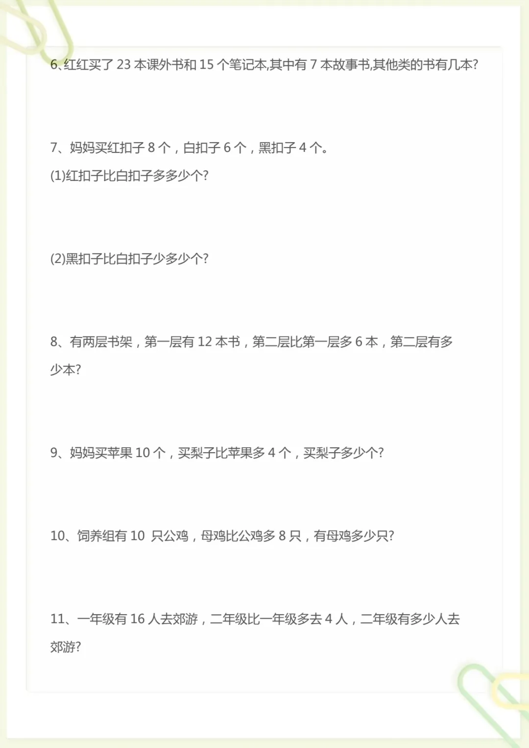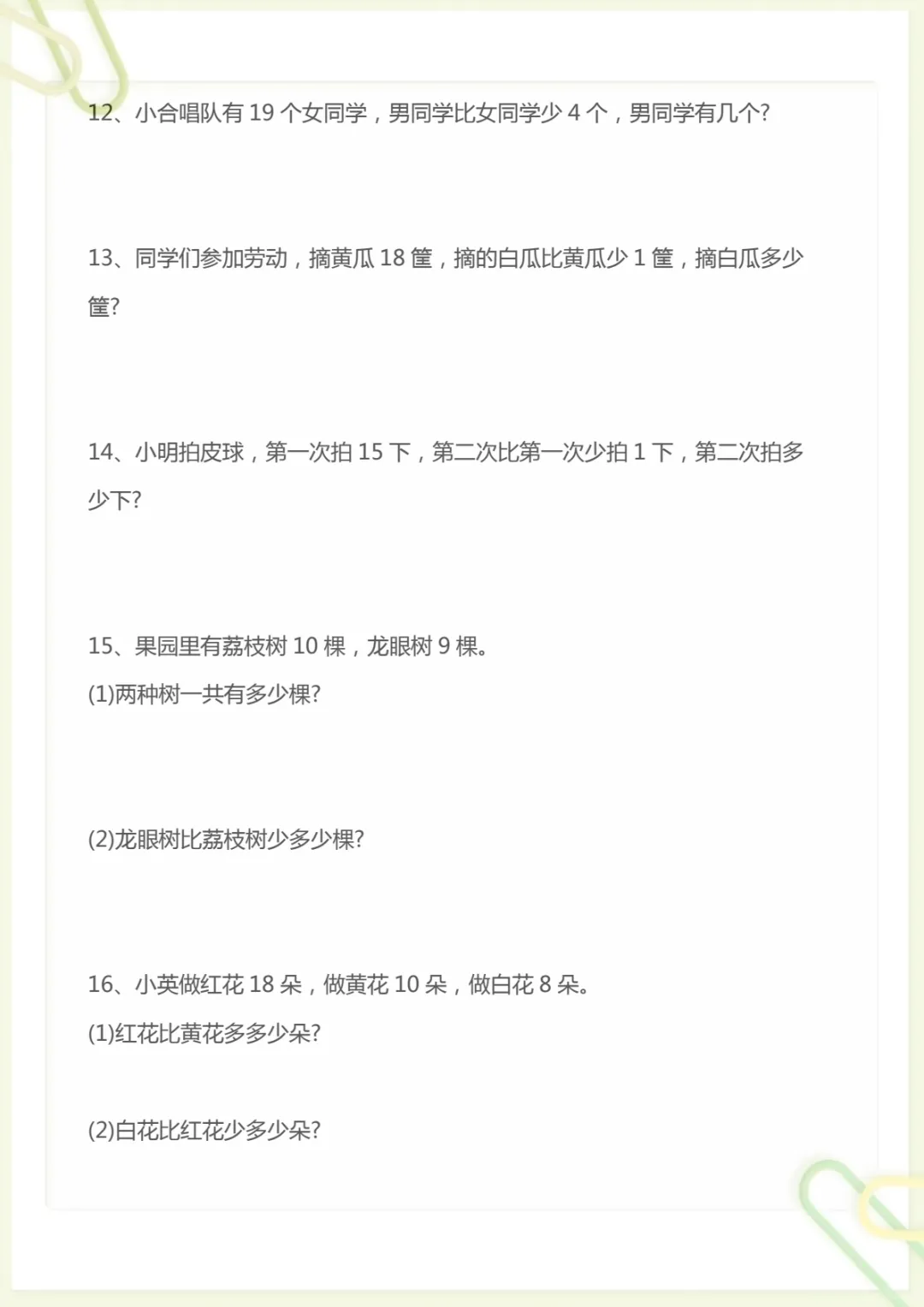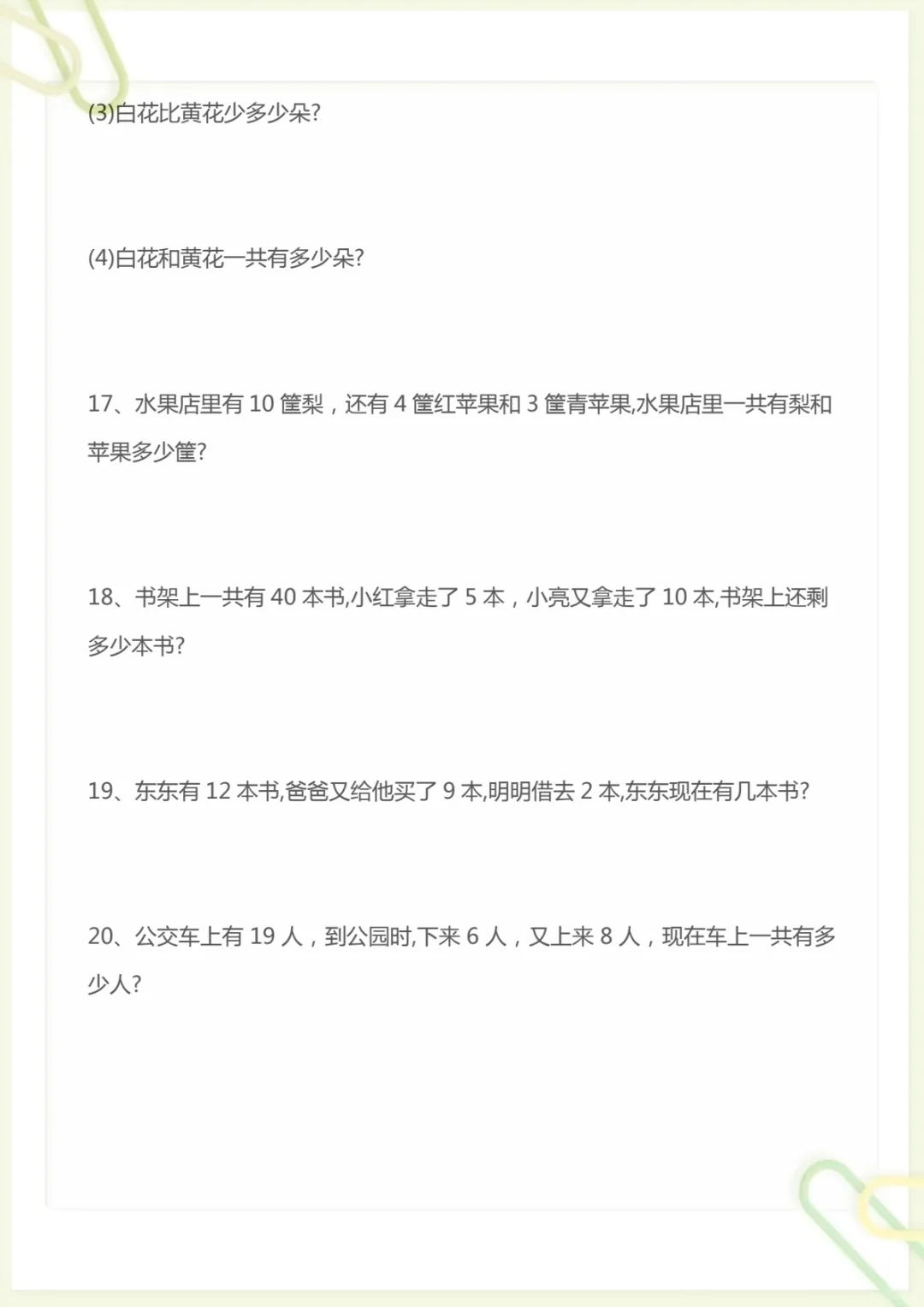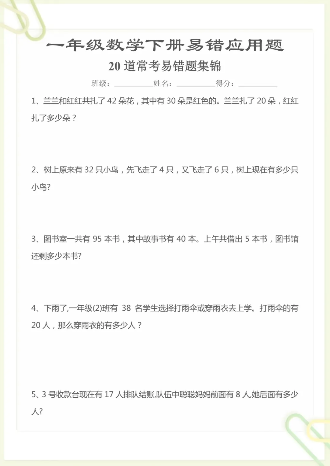一年级下数学易错应用题汇总20道,共4页,电子版可下载可打印,这份专项练习围绕一年级下册数学常见易错应用题进行整理,涵盖多个核心知识点与专项训练内容,帮助孩子在练习中理清数量关系、提升审题能力,及时发现并纠正常见出错点,更有针对性地巩固所学内容。需要的家长可以抓紧下载打印出来,让孩子认真练一练。