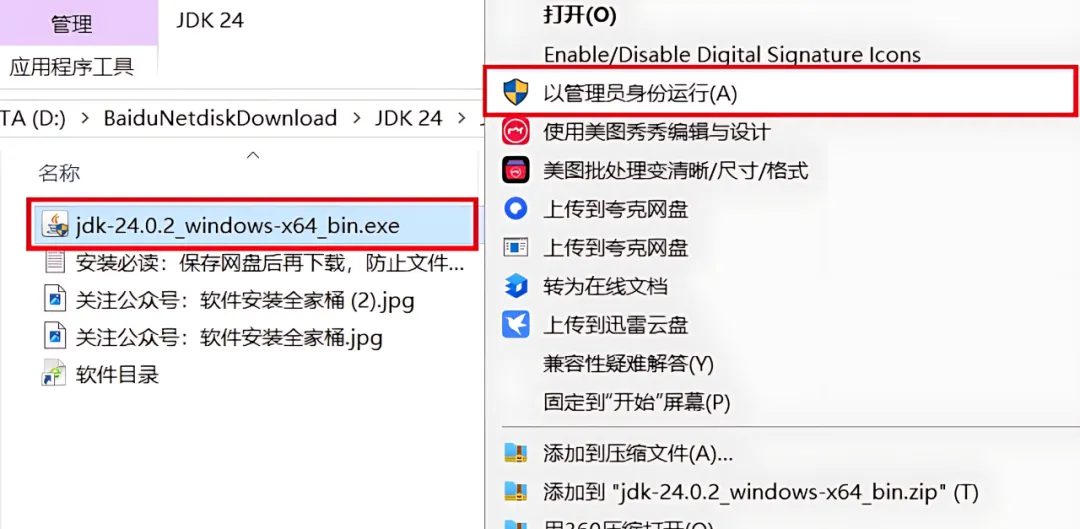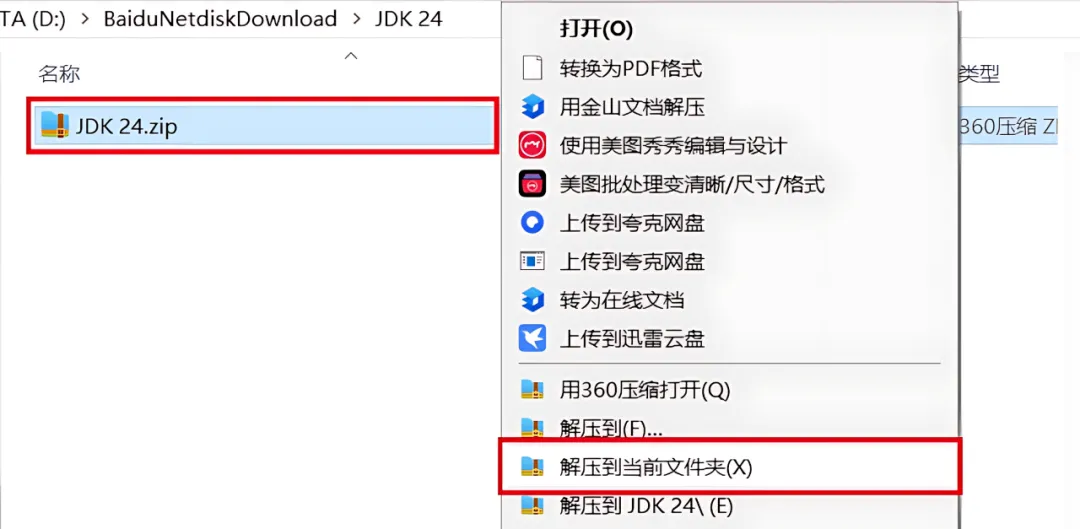 1、下载JDK24软件安装包到电脑上,右键选择【解压到当前文件夹】。