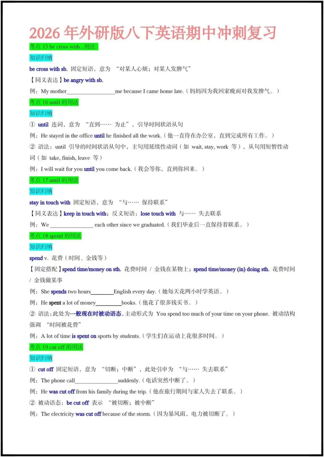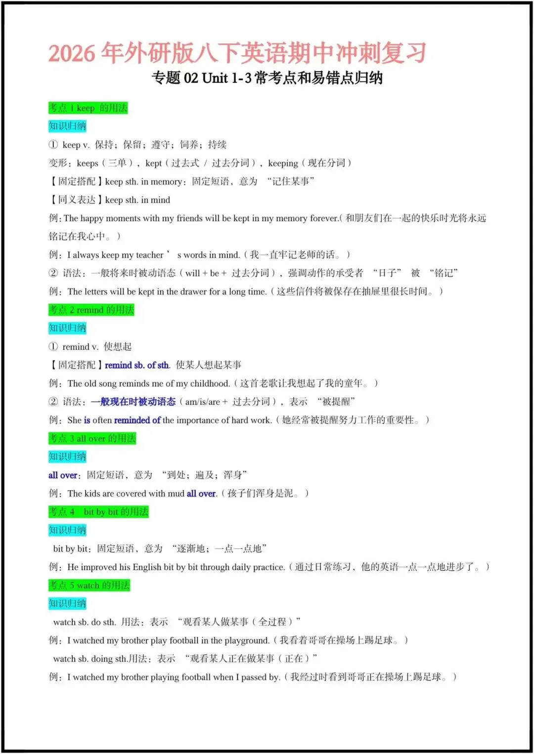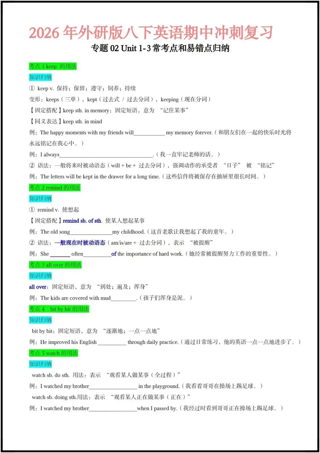 这份资料是期中冲刺专用的考点速记清单,聚焦外研版八下前3单元,按“动词/短语用法+语法+易混辨析”的逻辑整理,每个考点都搭配了典型例句和填空练习,非常适合学生自查和背诵。