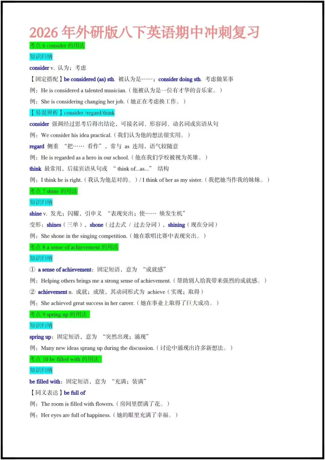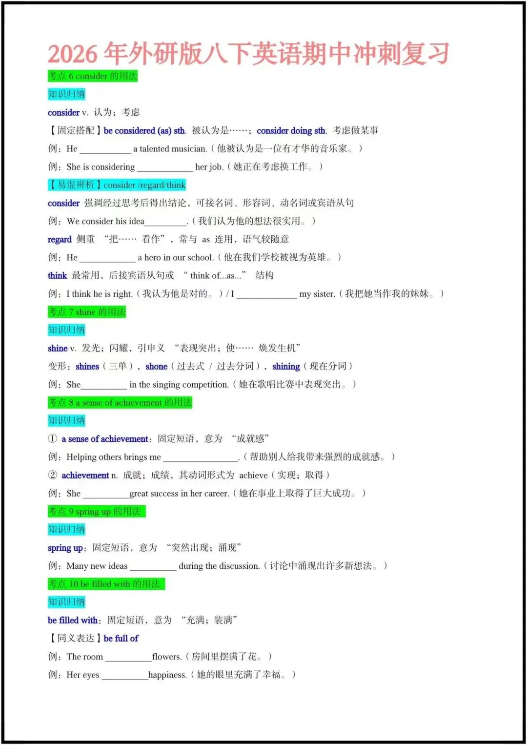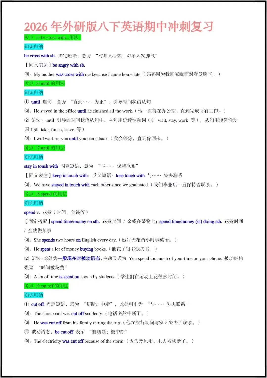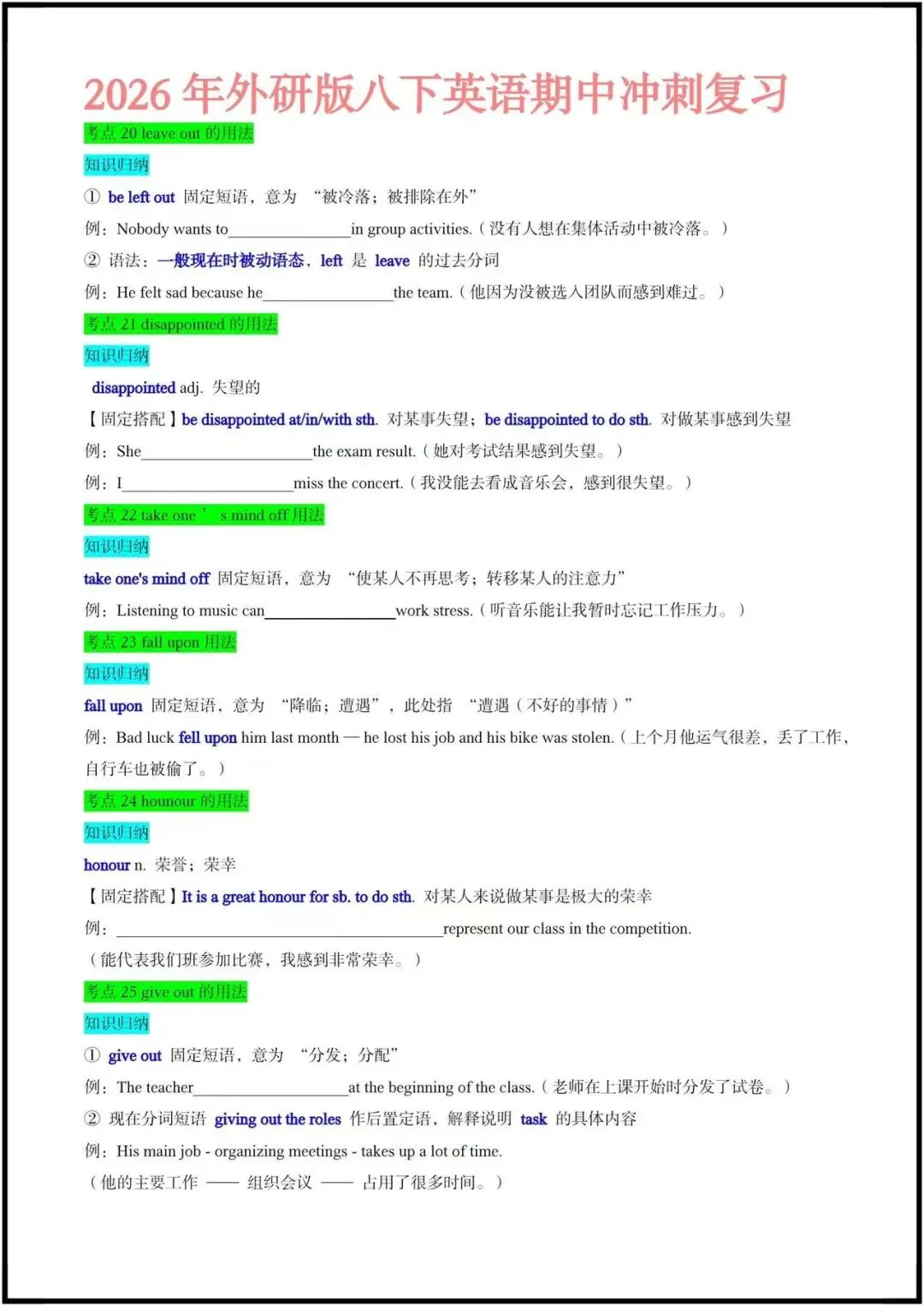 这份资料是期中冲刺专用的考点速记清单,聚焦外研版八下前3单元,按“动词/短语用法+语法+易混辨析”的逻辑整理,每个考点都搭配了典型例句和填空练习,非常适合学生自查和背诵。