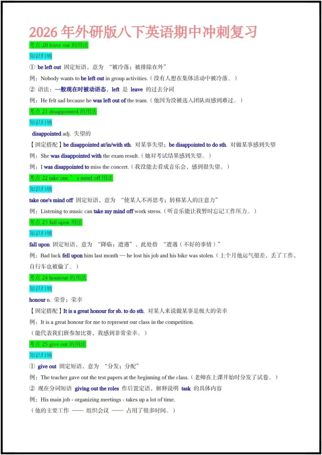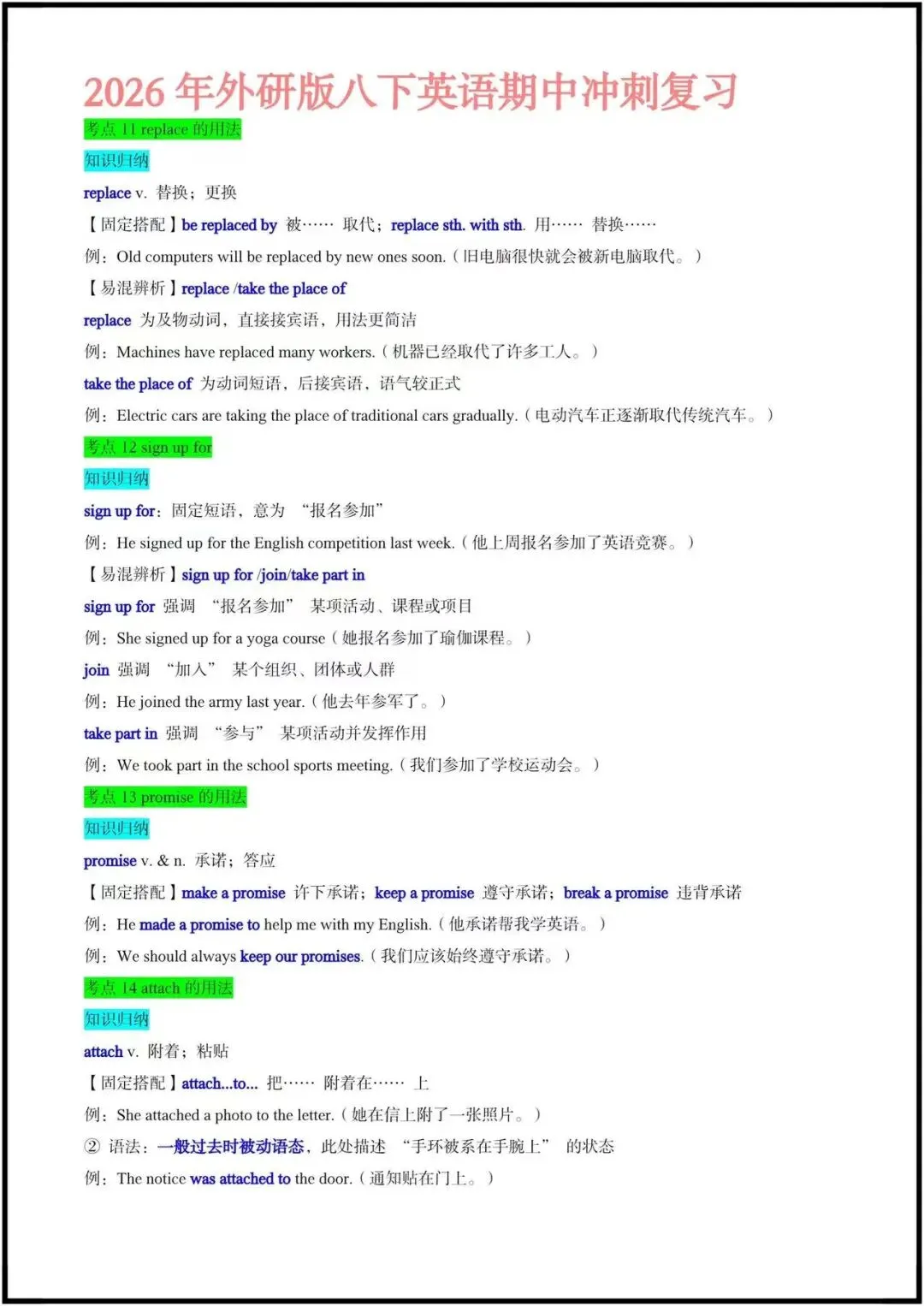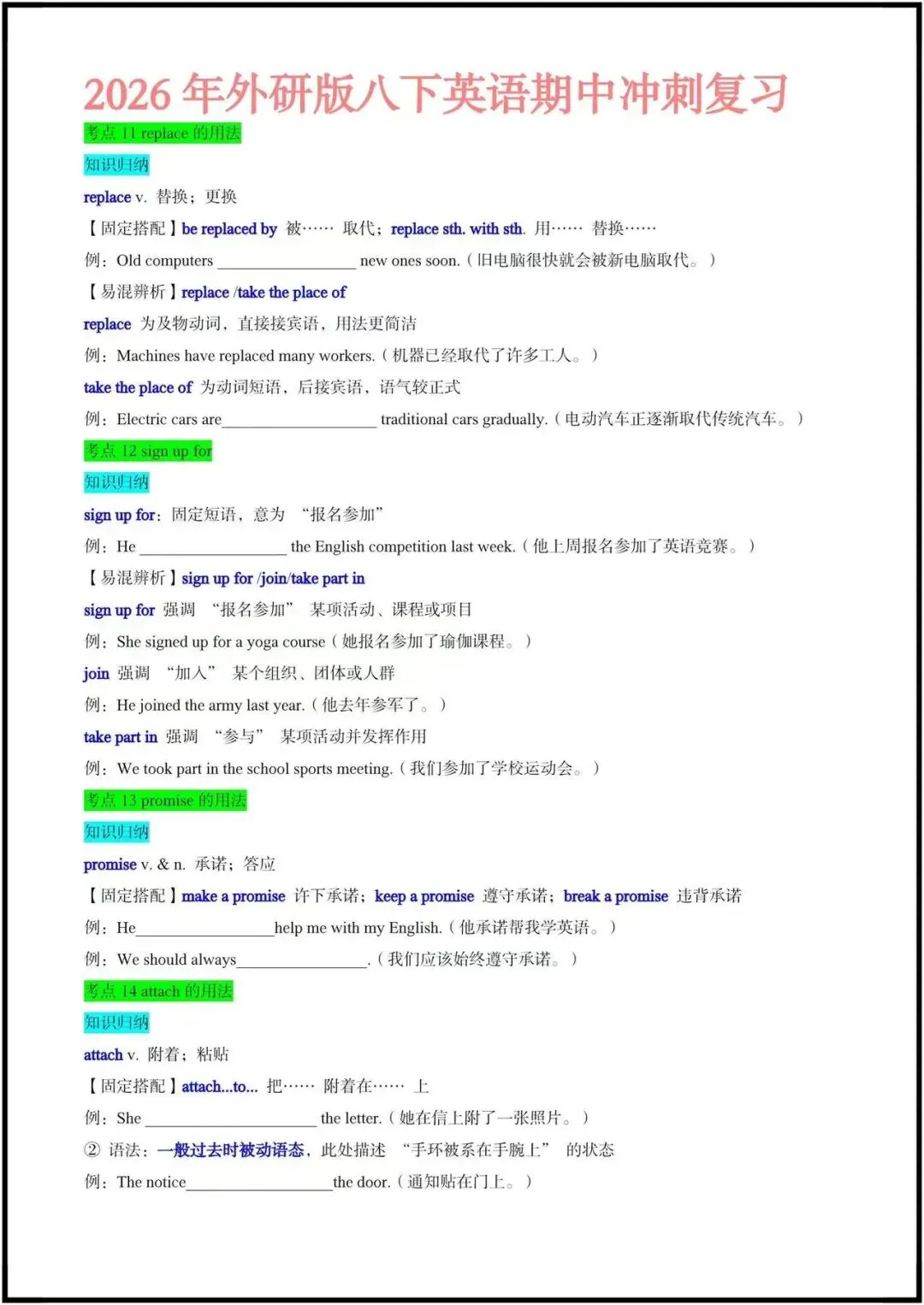 今日老师精心整理了:八下英语|期中冲刺复习:Unit1-3常考点+易错点归纳(练习版+答案版)电子版可打印!更多细节,我们在正文中为您展示欢迎继续阅读至文章末尾。