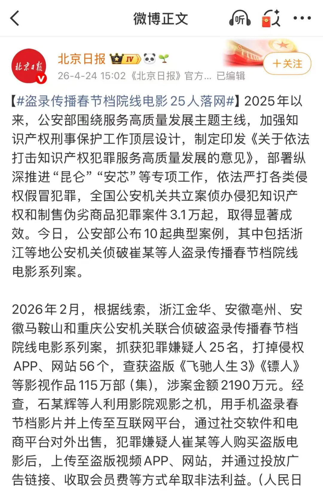 昨日,公安部公布了一起典型大案:浙江、安徽、重庆多地警方联合出手,一举打掉这个盗录传播春节档电影的犯罪团伙,抓获 25 名嫌疑人,查封 56 个侵权 APP 和网站,涉案金额高达2190 万元。