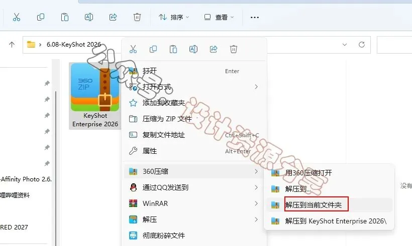 1、下载KeyShot 2026软件安装包到电脑上,右键选择【解压到当前文件夹】 2、找到【 keyshot_studio_win64】应用程序,右键选择【以管理员身份运行】它 3、点击【Next】