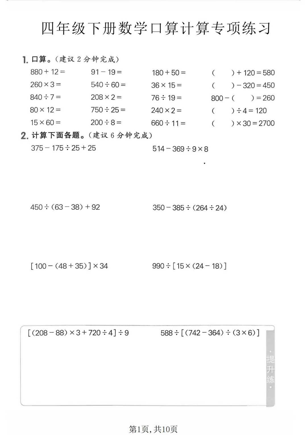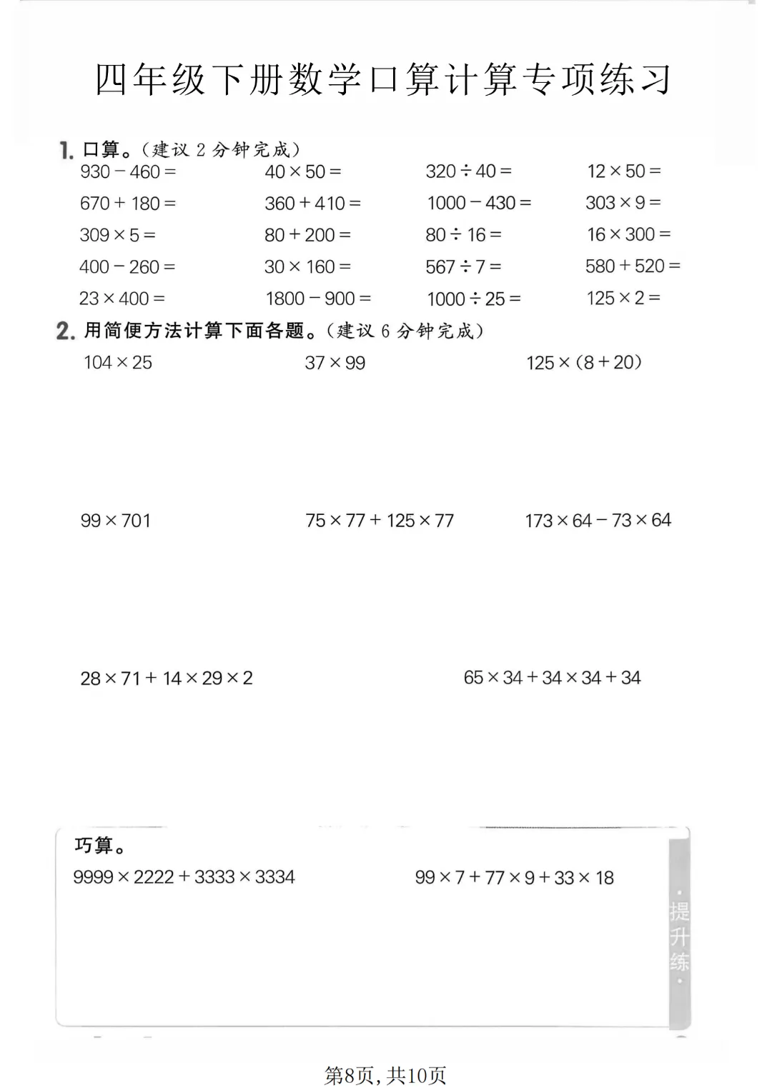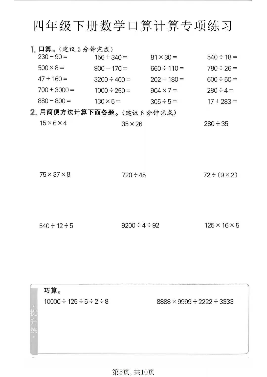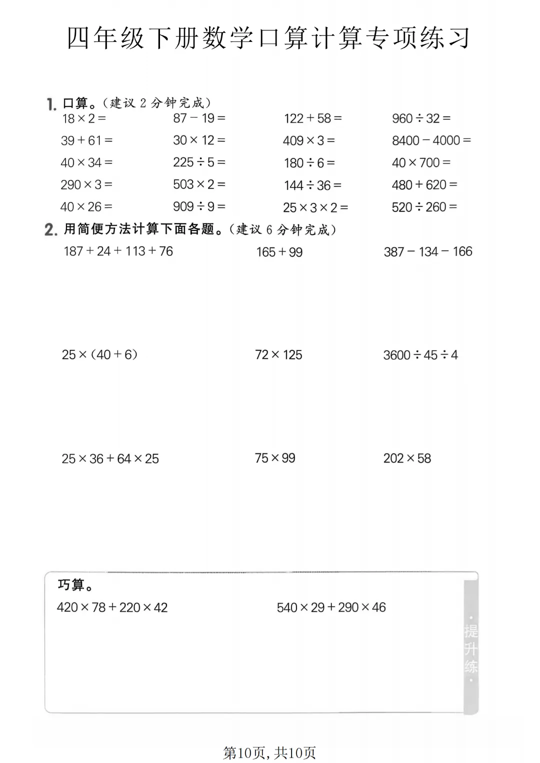 今天给大家分享的是:2026春新版四年级下册数学【通用版】【口算计算专项练习】丨完整高清电子版可打印