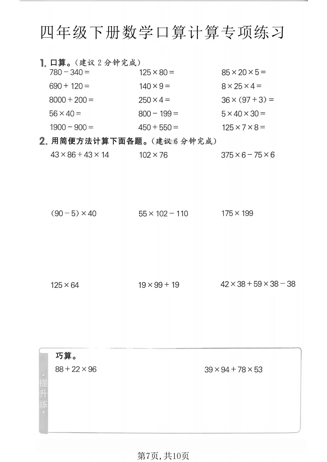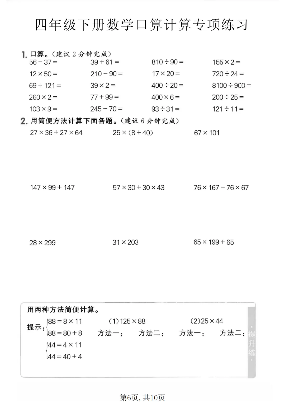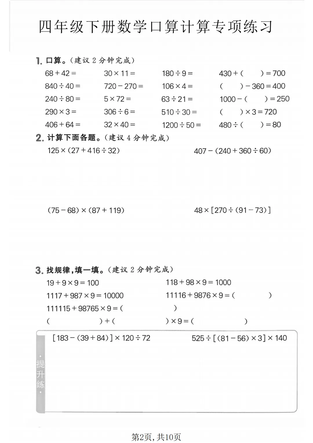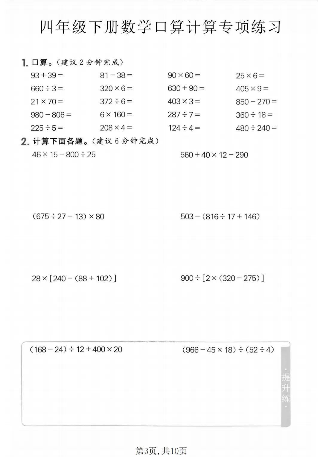 今天给大家分享的是:2026春新版四年级下册数学【通用版】【口算计算专项练习】丨完整高清电子版可打印