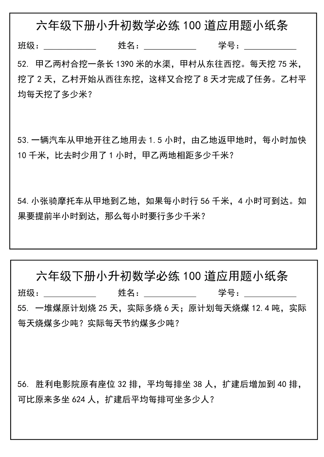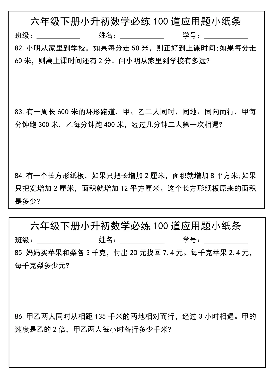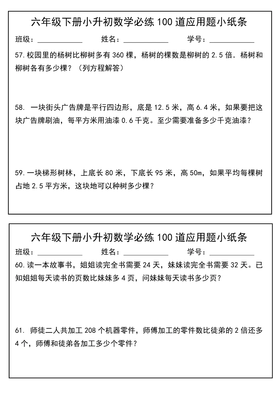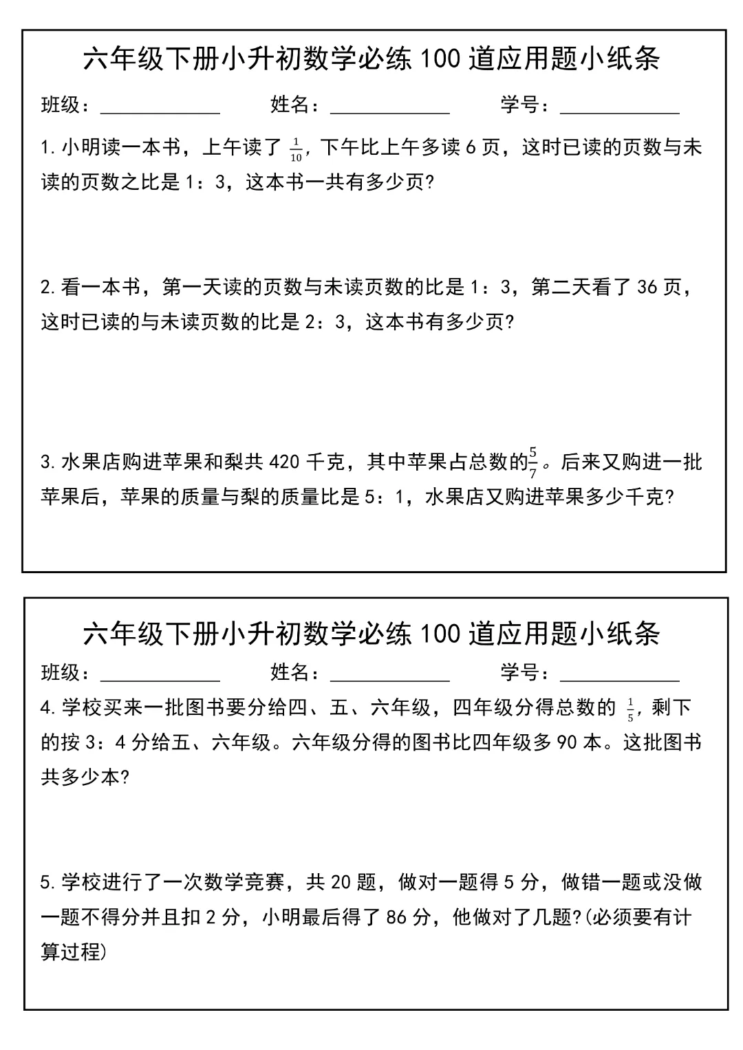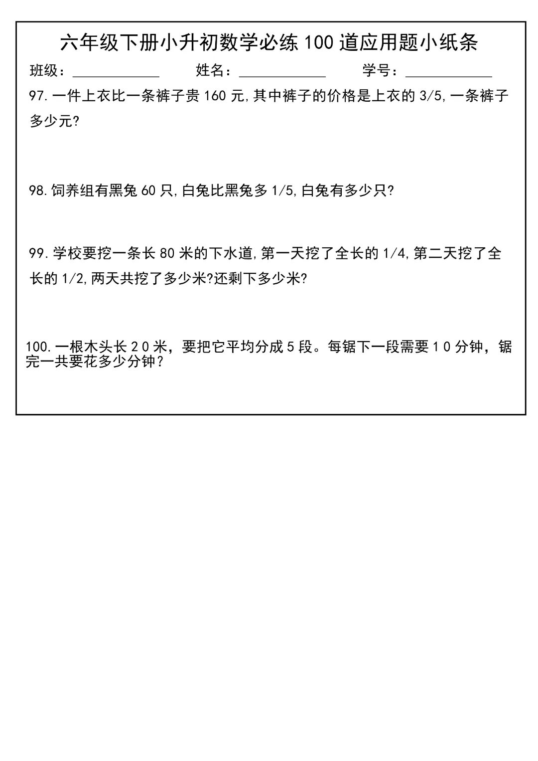 今天给大家分享的是:2026春新版六年级下册数学【通用版】【小升初每日必练100道应用题小纸条】丨完整高清电子版可打印