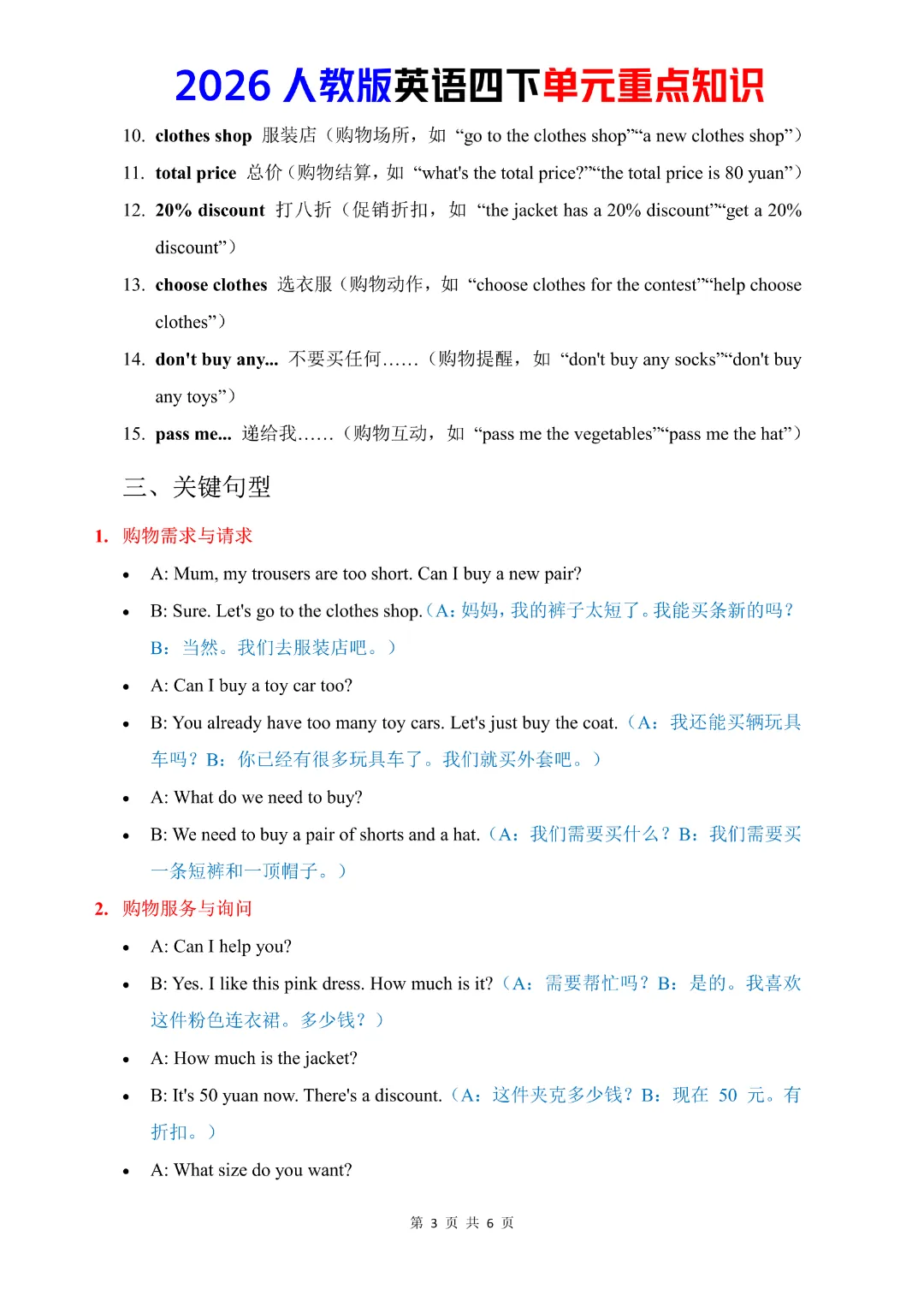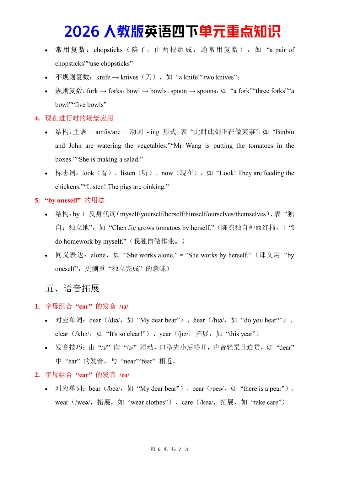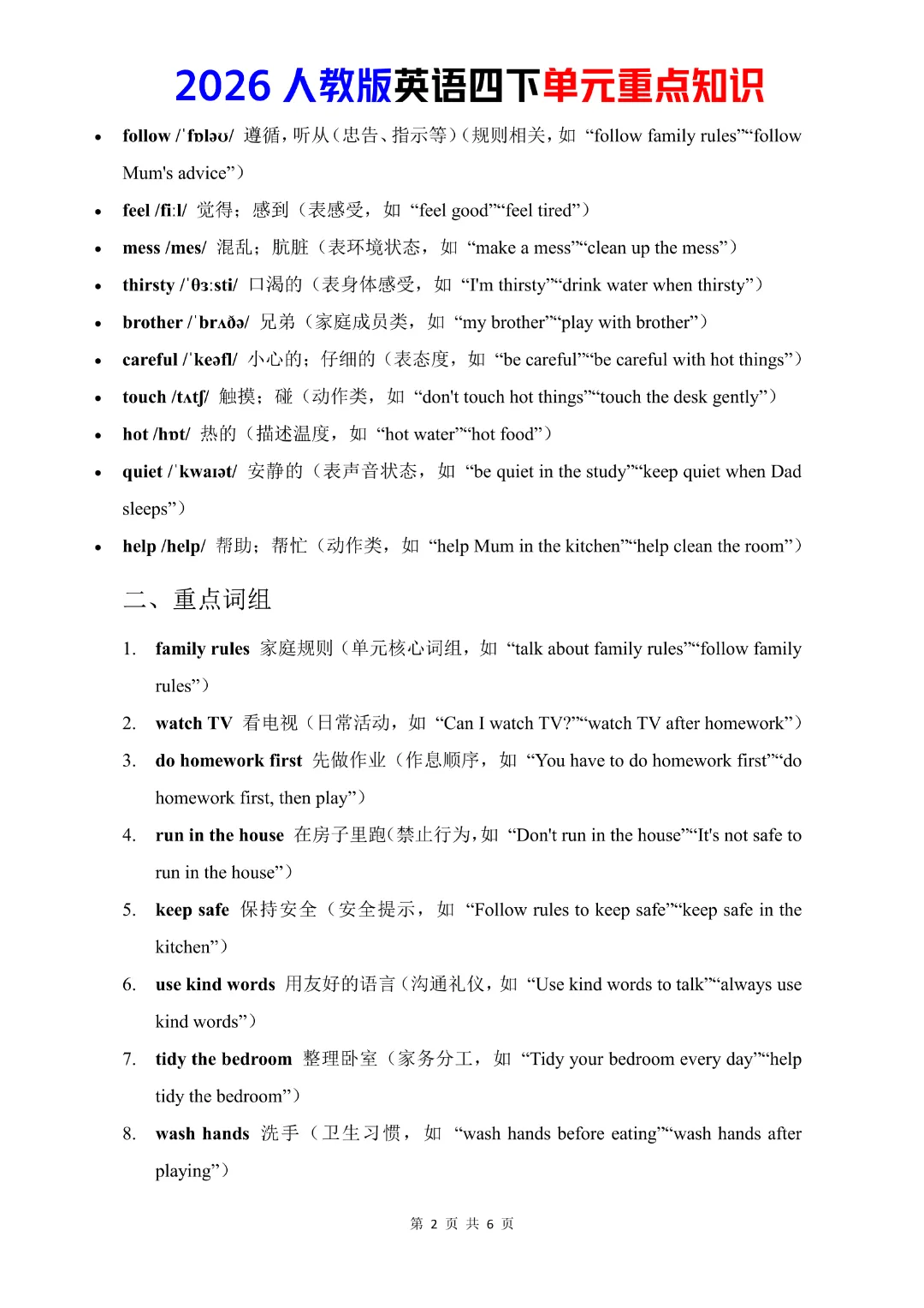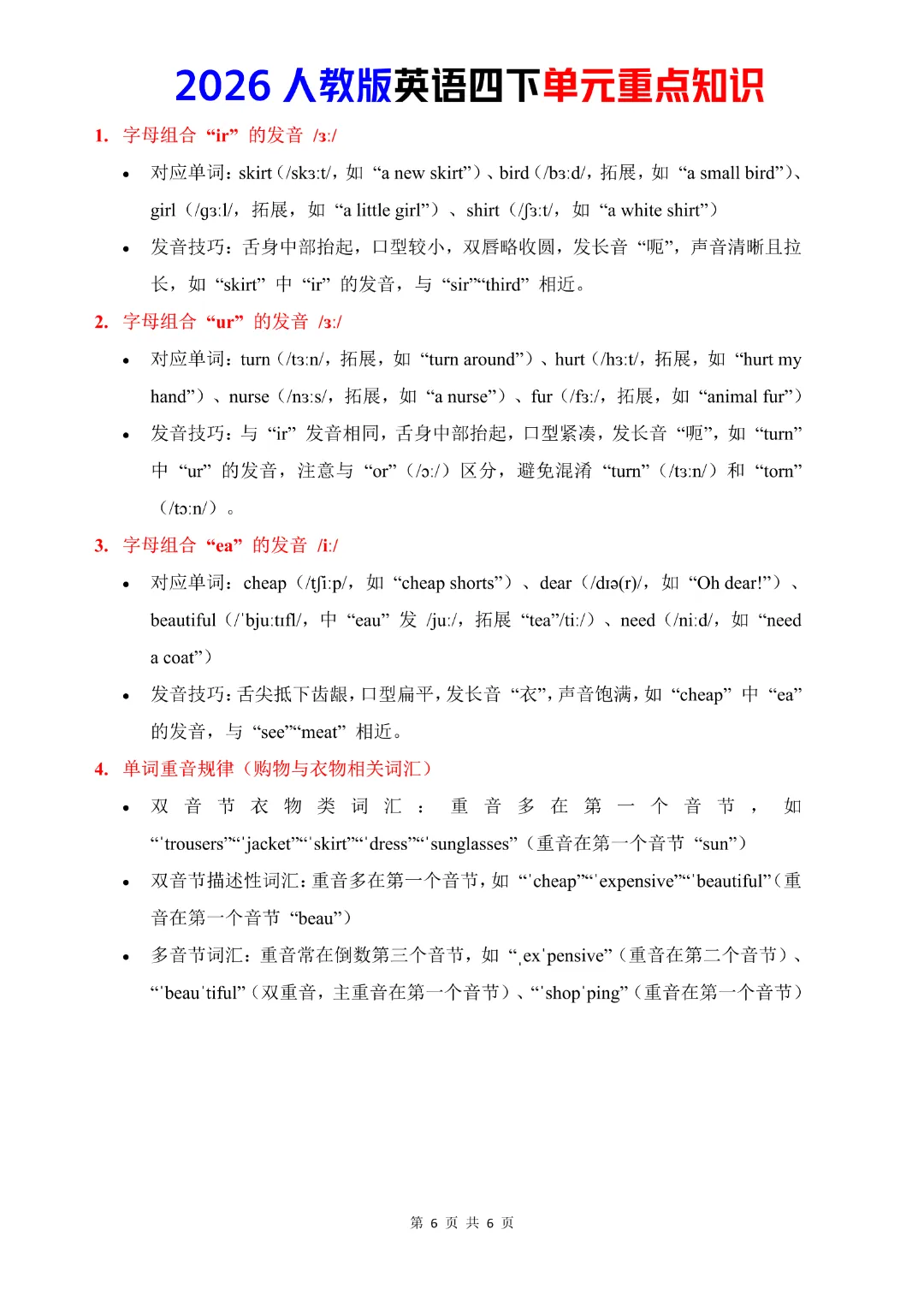 今天给大家分享的是:2026春新版四年级下册英语【人教PEP版】【第1-6单元Unit 1-Unit6单元重点知识汇总】丨完整高清电子版可打印