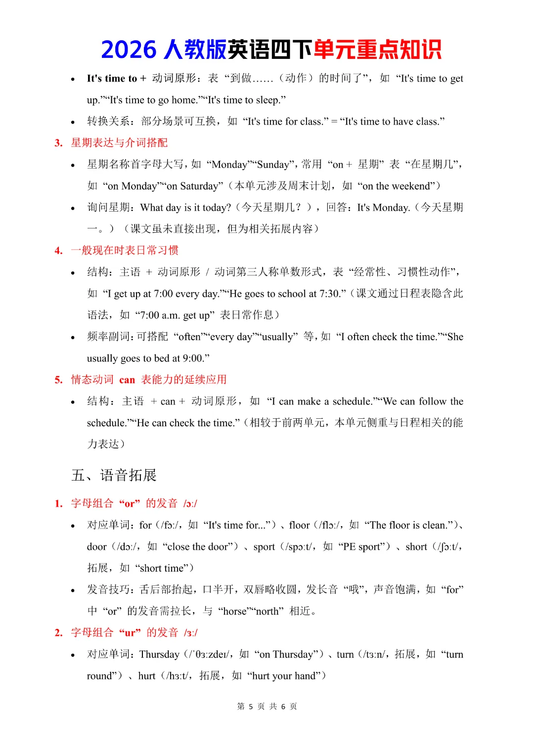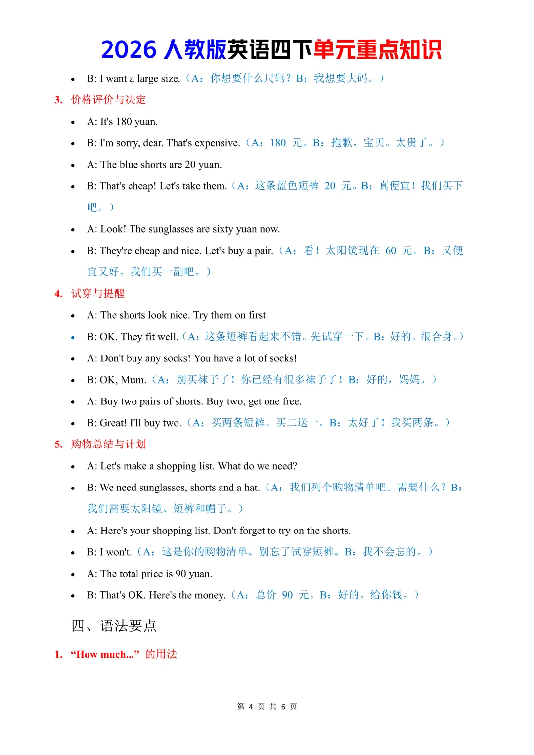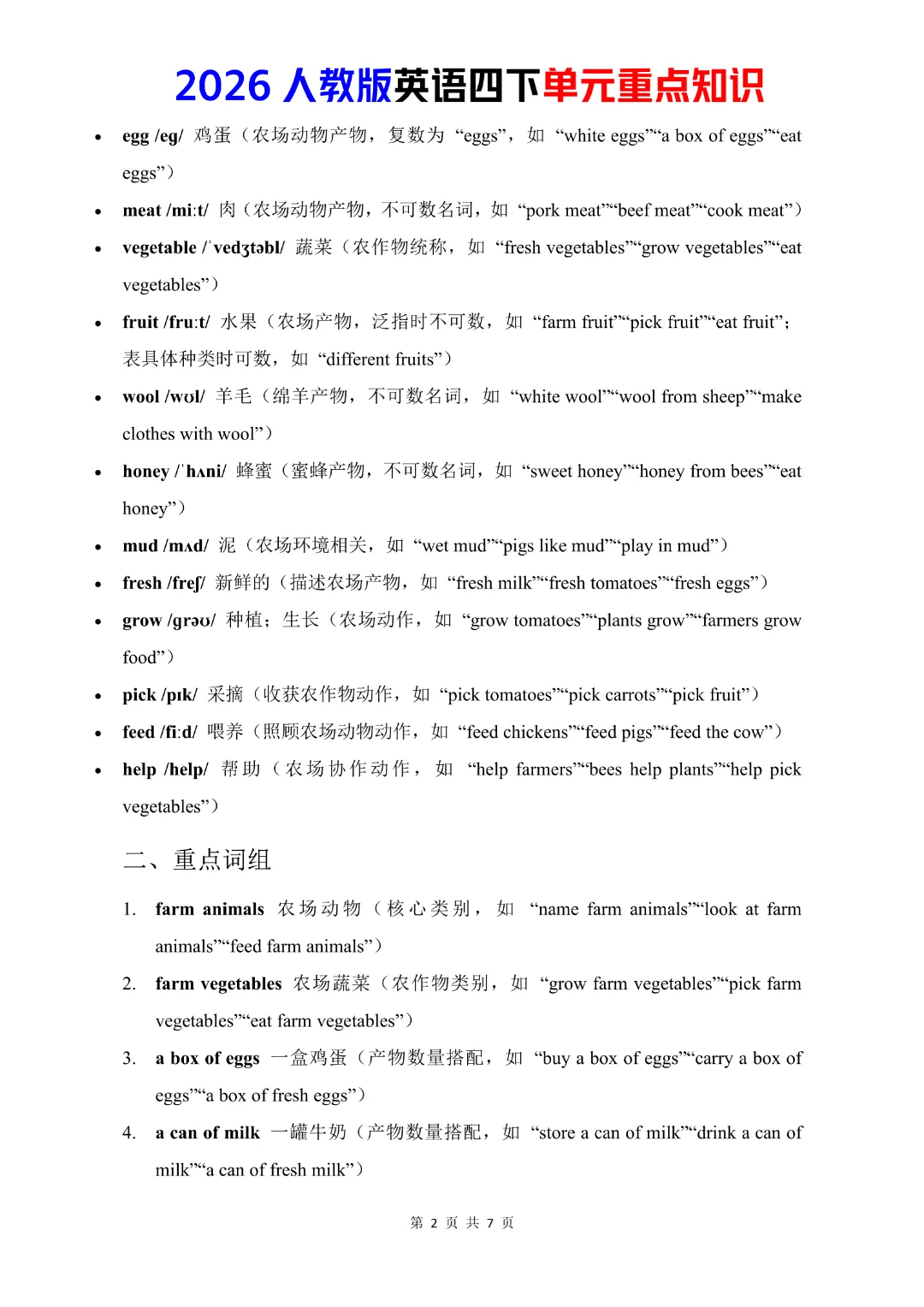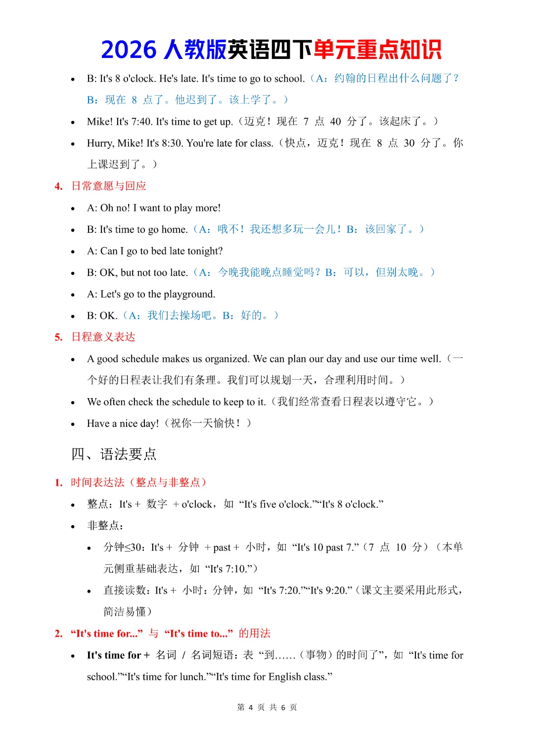 今天给大家分享的是:2026春新版四年级下册英语【人教PEP版】【第1-6单元Unit 1-Unit6单元重点知识汇总】丨完整高清电子版可打印