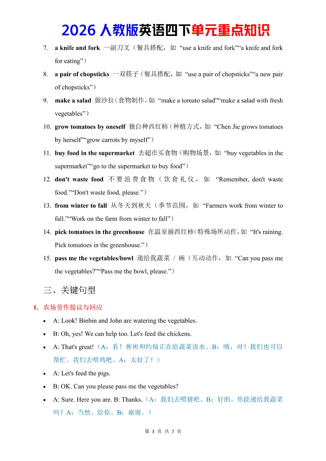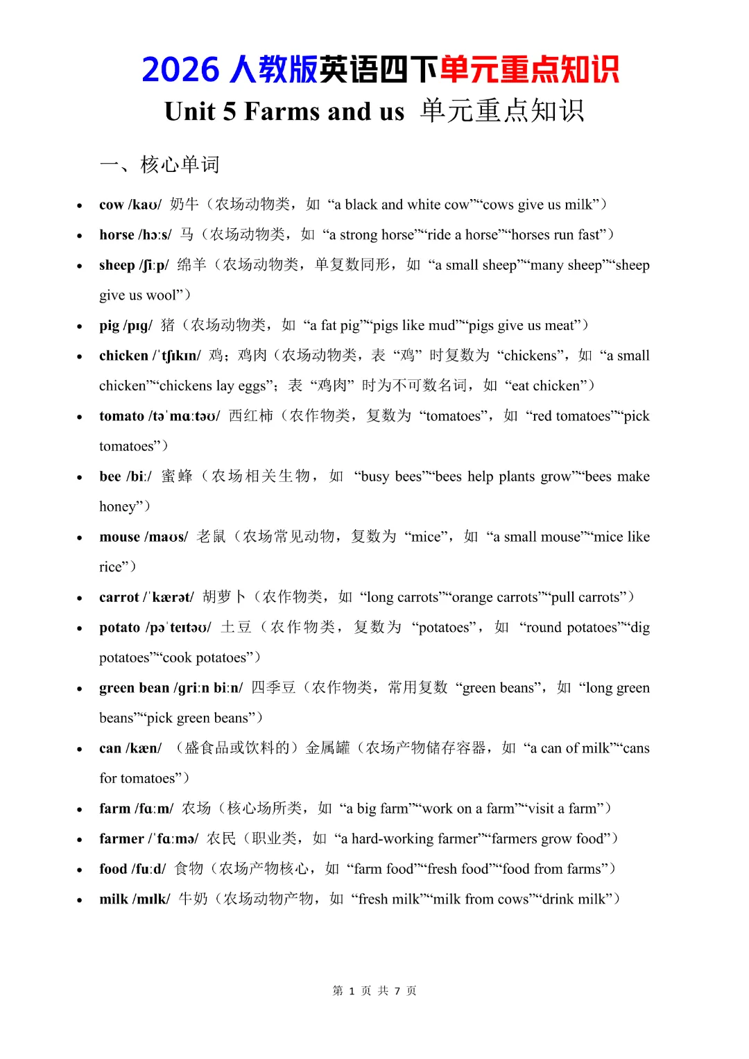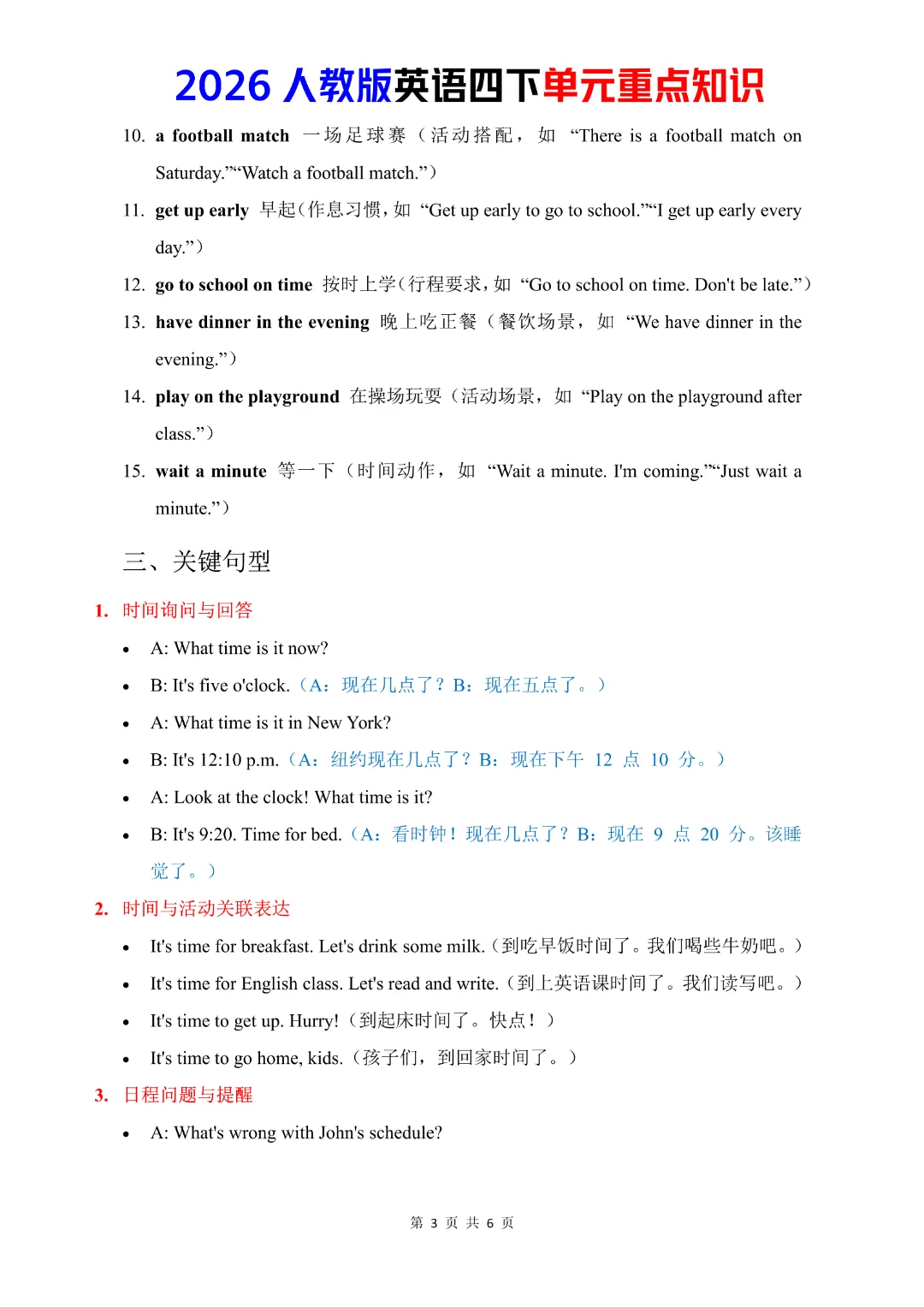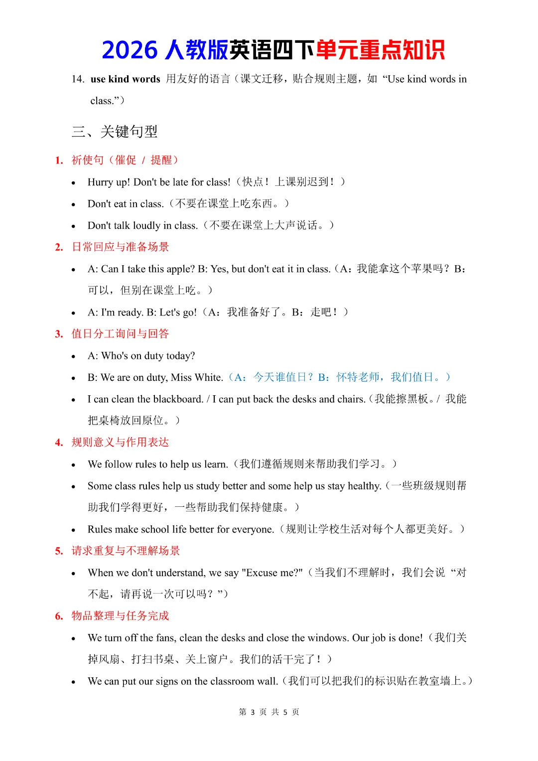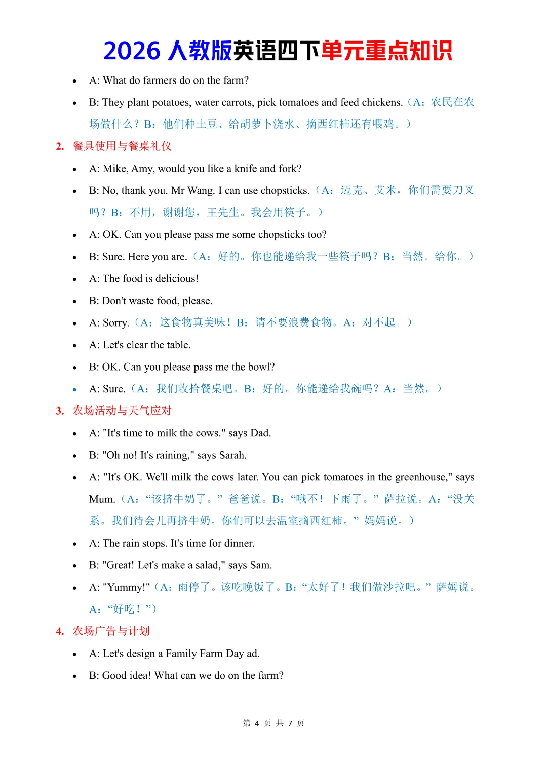 今天给大家分享的是:2026春新版四年级下册英语【人教PEP版】【第1-6单元Unit 1-Unit6单元重点知识汇总】丨完整高清电子版可打印
