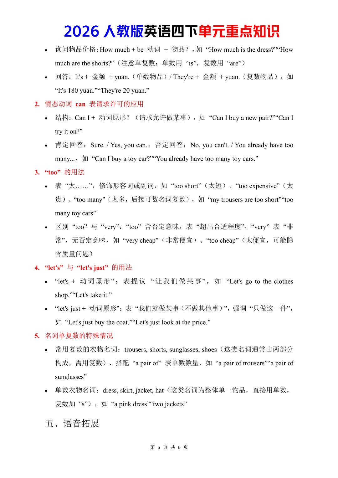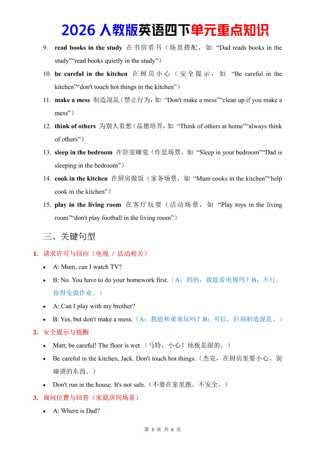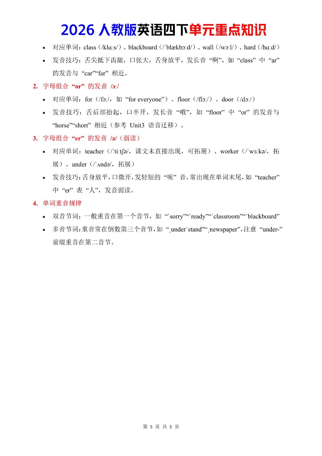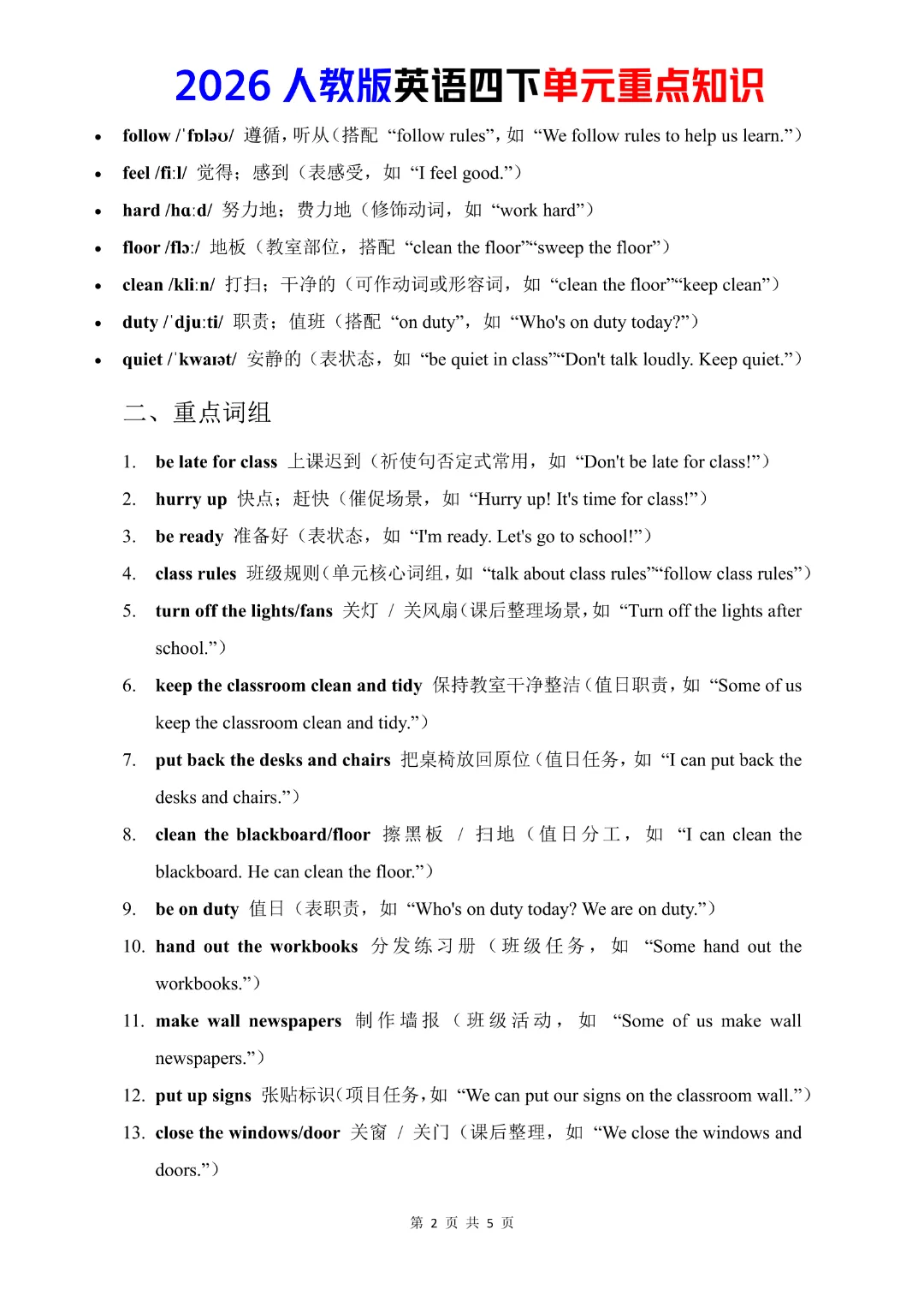 今天给大家分享的是:2026春新版四年级下册英语【人教PEP版】【第1-6单元Unit 1-Unit6单元重点知识汇总】丨完整高清电子版可打印