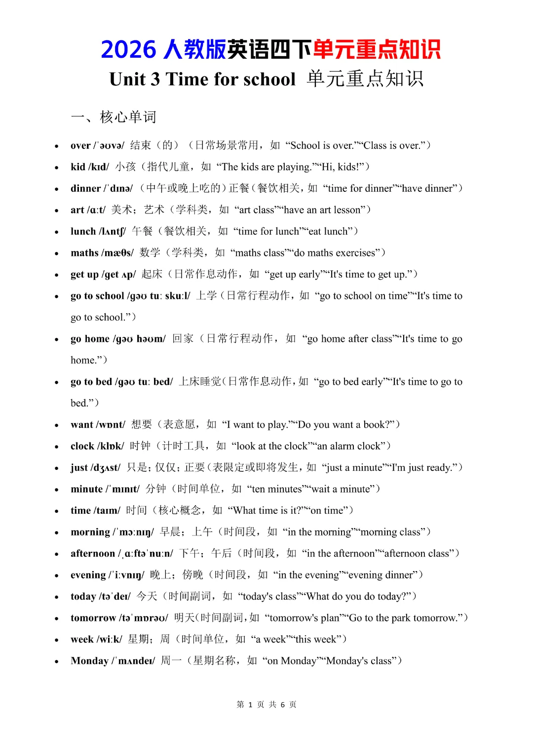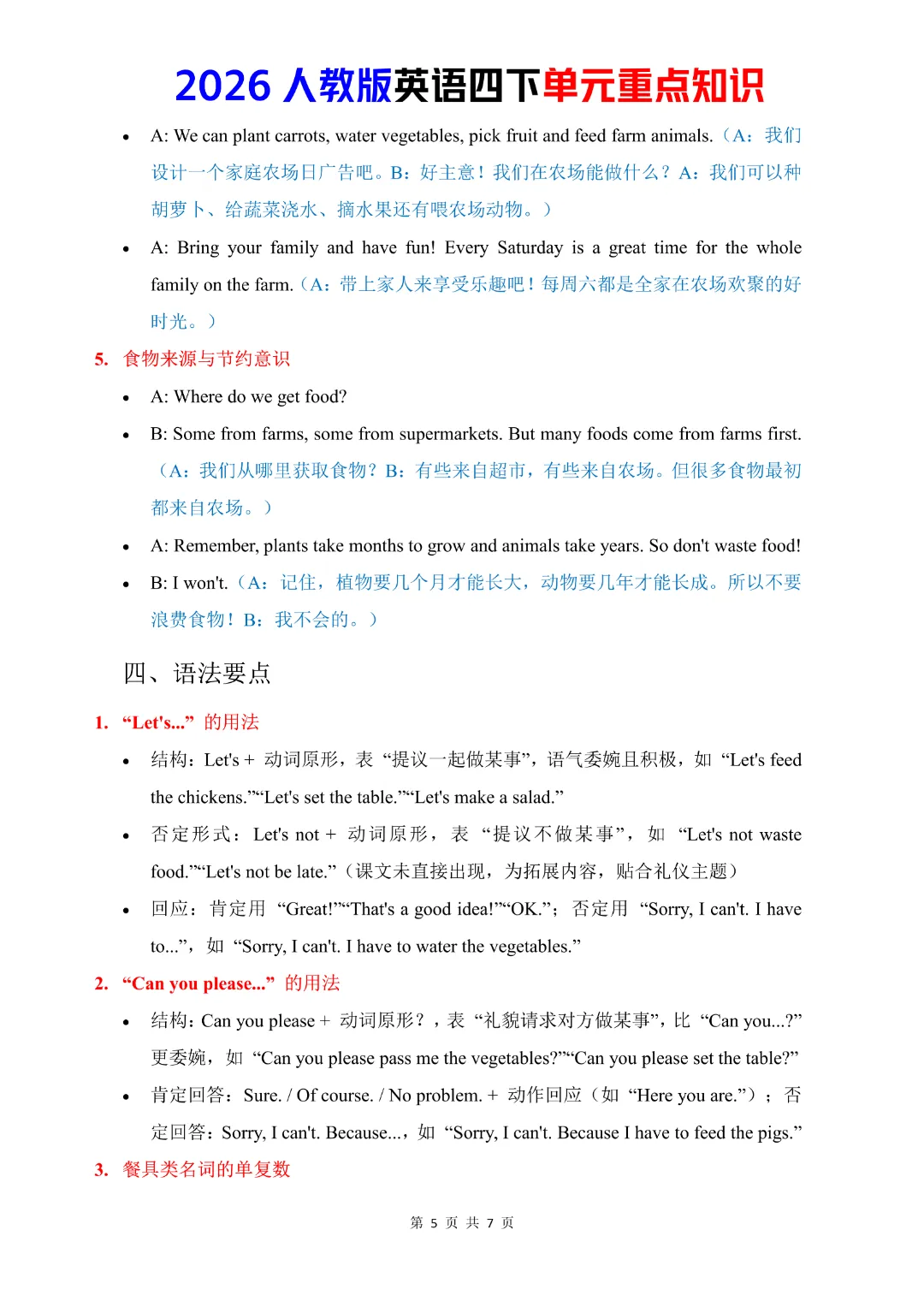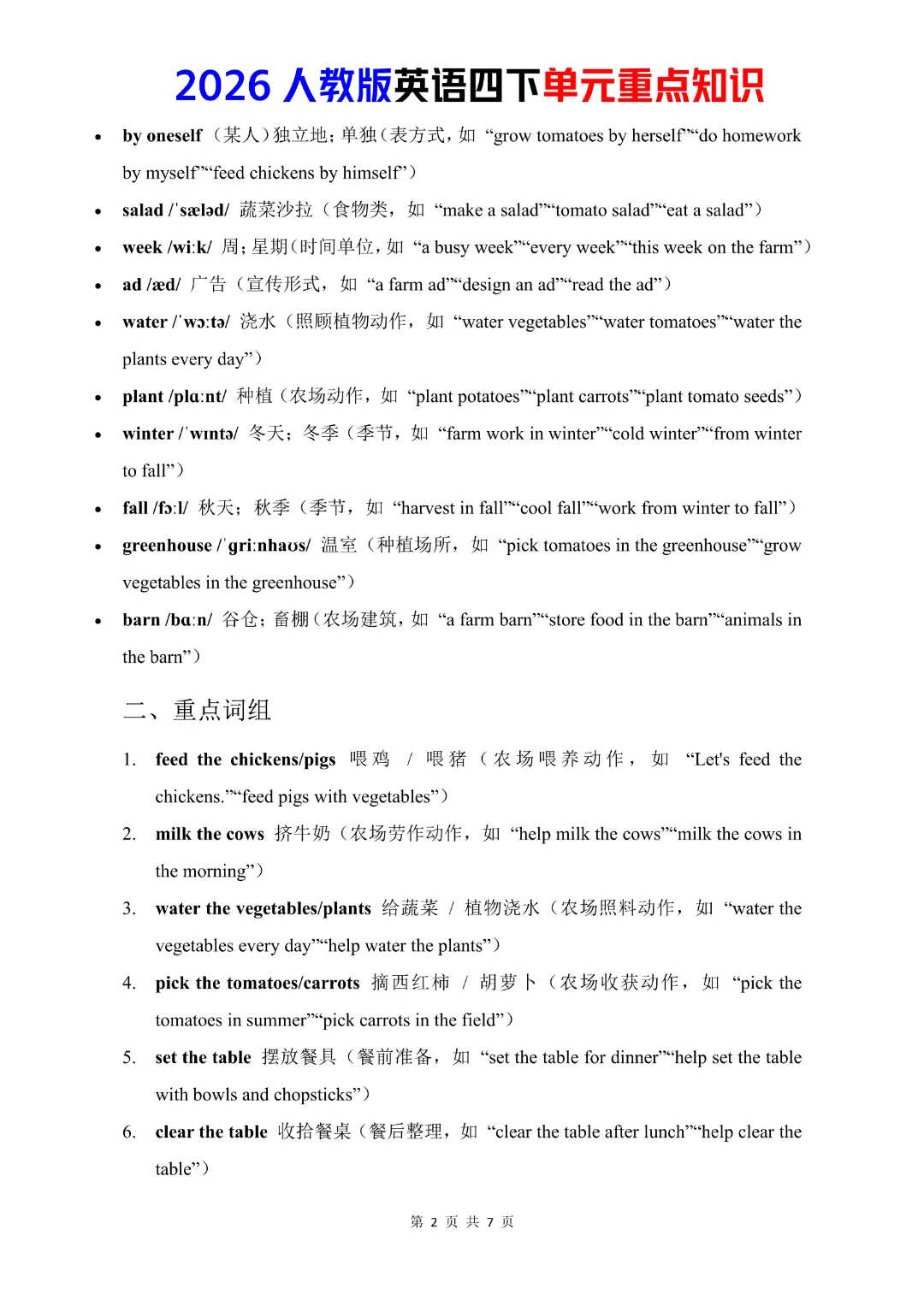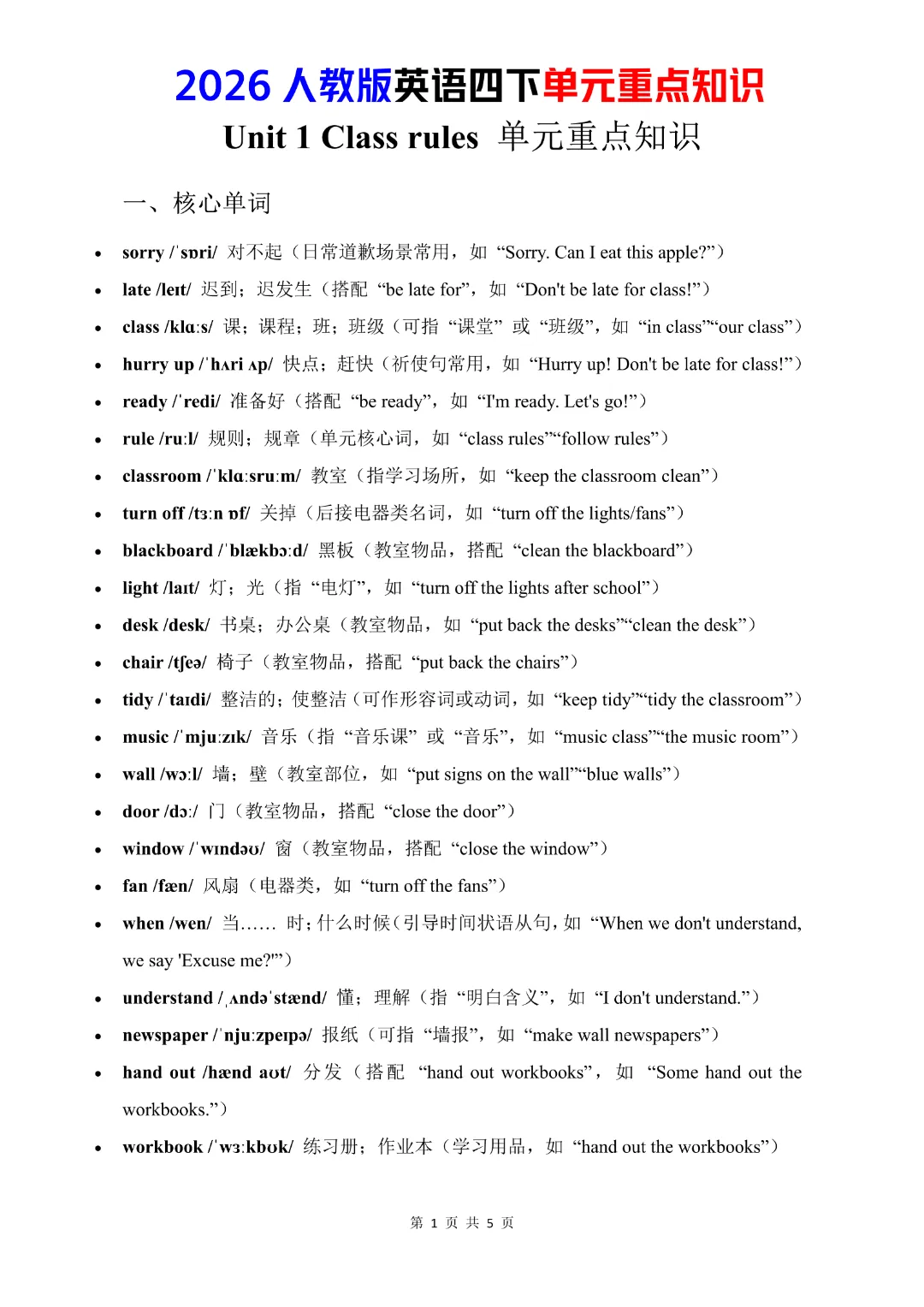 今天给大家分享的是:2026春新版四年级下册英语【人教PEP版】【第1-6单元Unit 1-Unit6单元重点知识汇总】丨完整高清电子版可打印