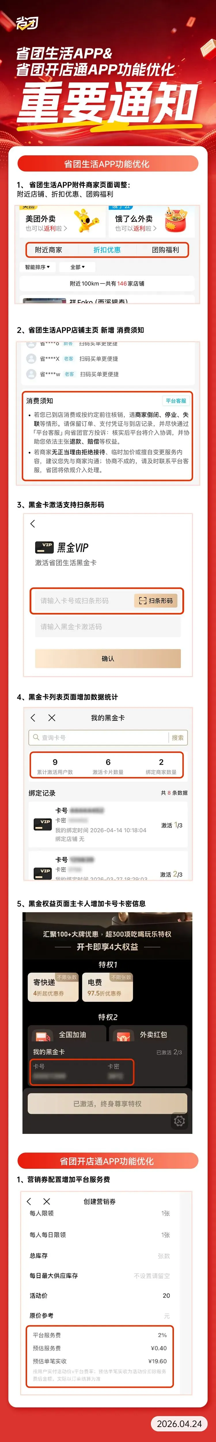 重要通知!省团生活APP&省团开店通APP功能优化!一、省团生活APP功能优化1、 省团生活APP附件商家页面调整:附近店铺、折扣优惠、团购福利;2、省团生活APP店铺主页 新增 消费须知;3、黑金卡激活支持扫条形码;4、黑金卡列表页面增加数据统计;5、黑金权益页面主卡人增加卡号卡密信息。二、省团开店通APP功能优化1、营销券配置增加平台服务费。
