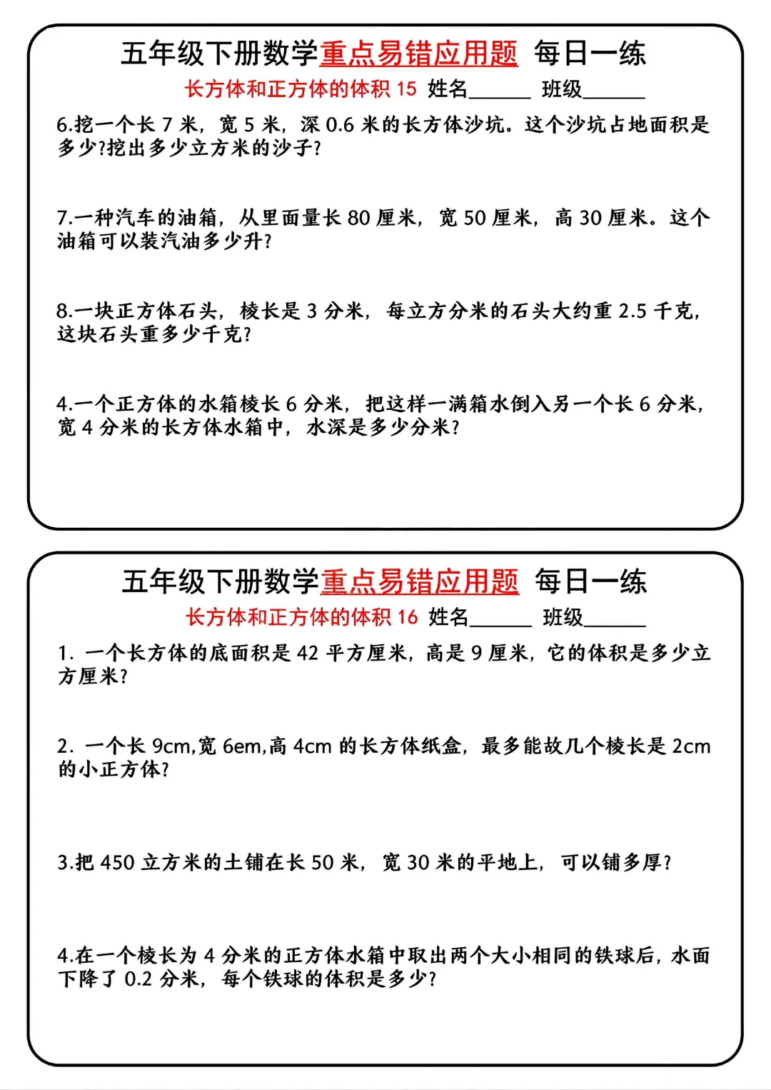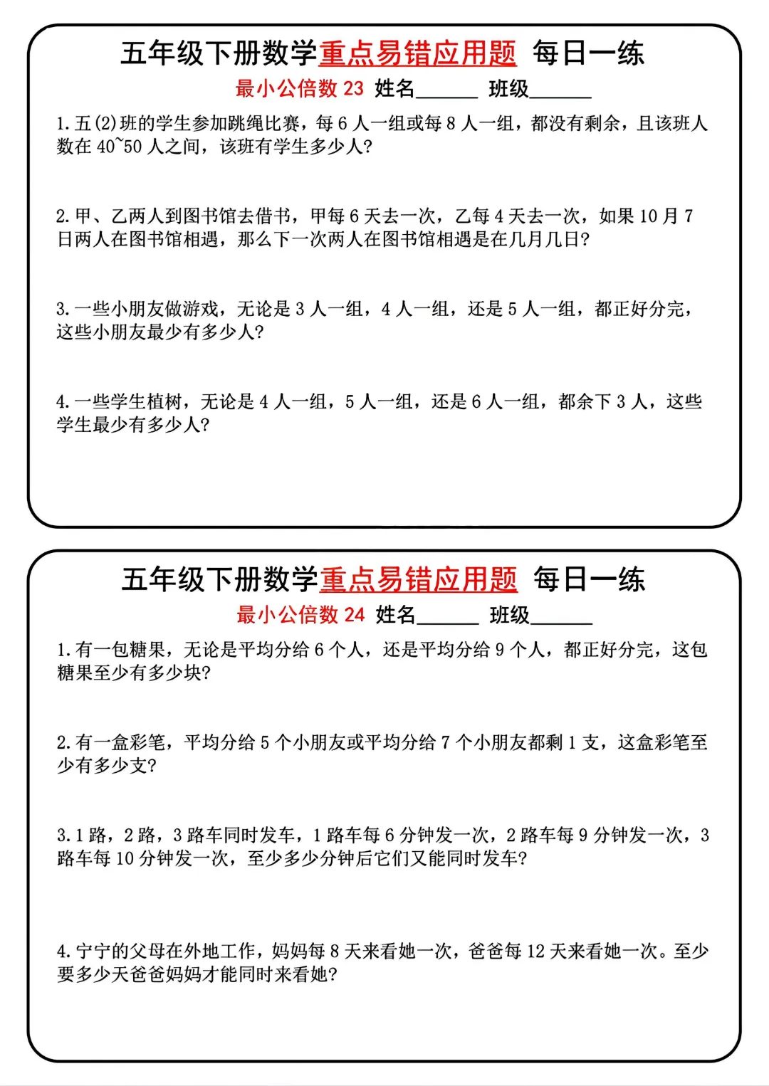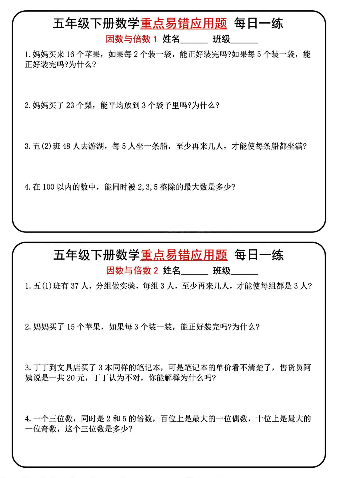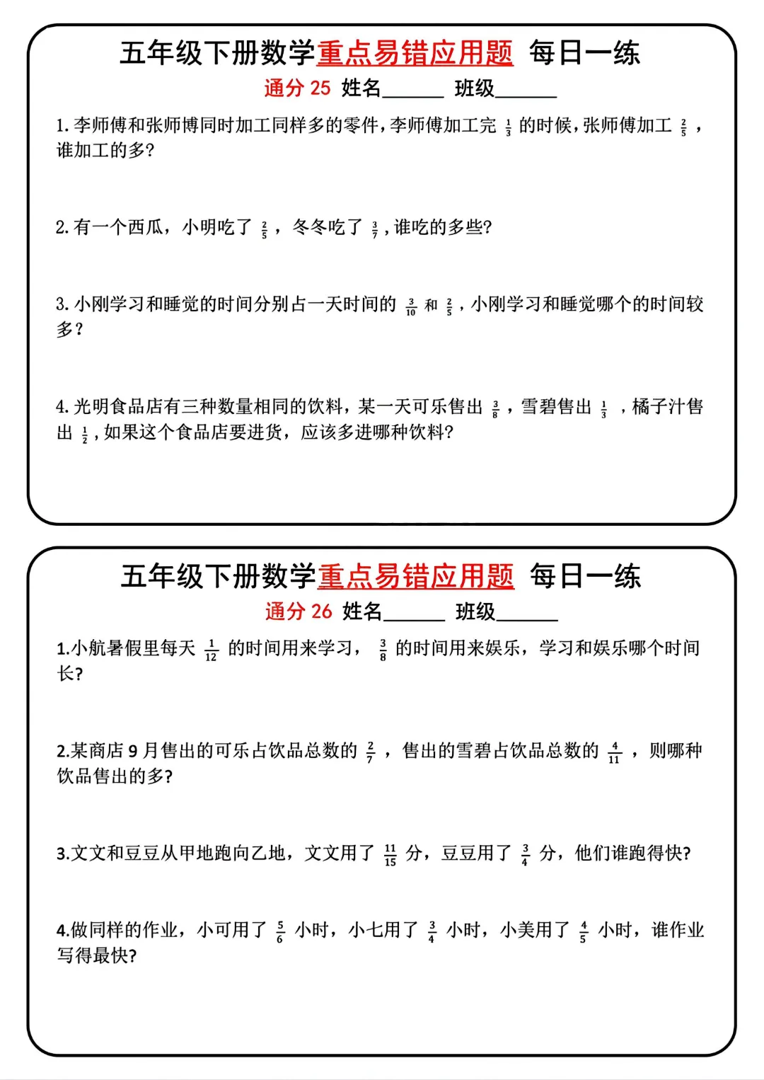 今天给大家分享的是:【五年级下册数学】【通用版】重点易错应用题每日一练|完整高清电子版可打印