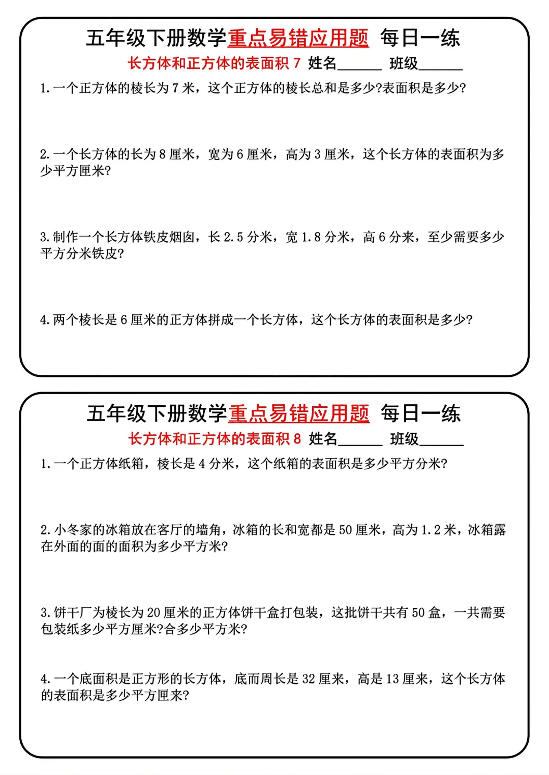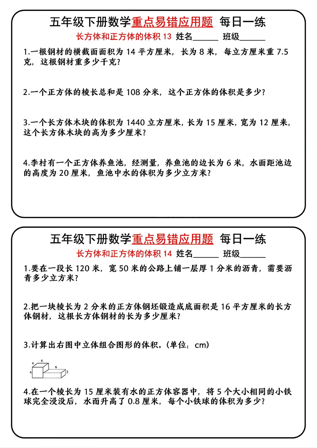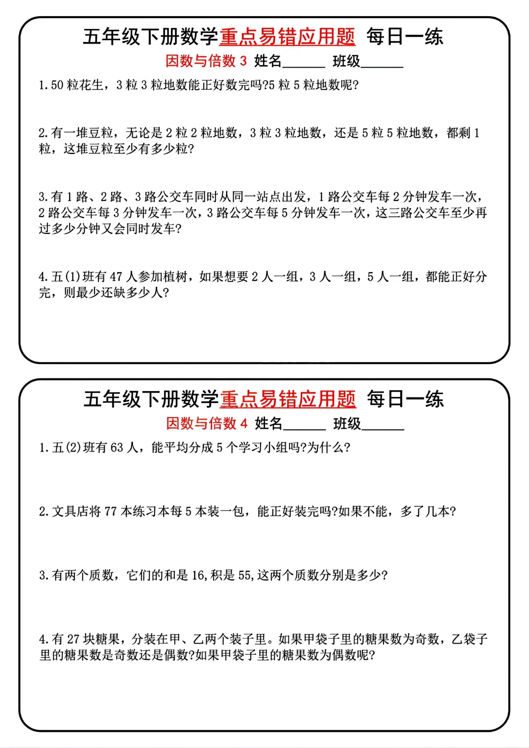 今天给大家分享的是:【五年级下册数学】【通用版】重点易错应用题每日一练|完整高清电子版可打印