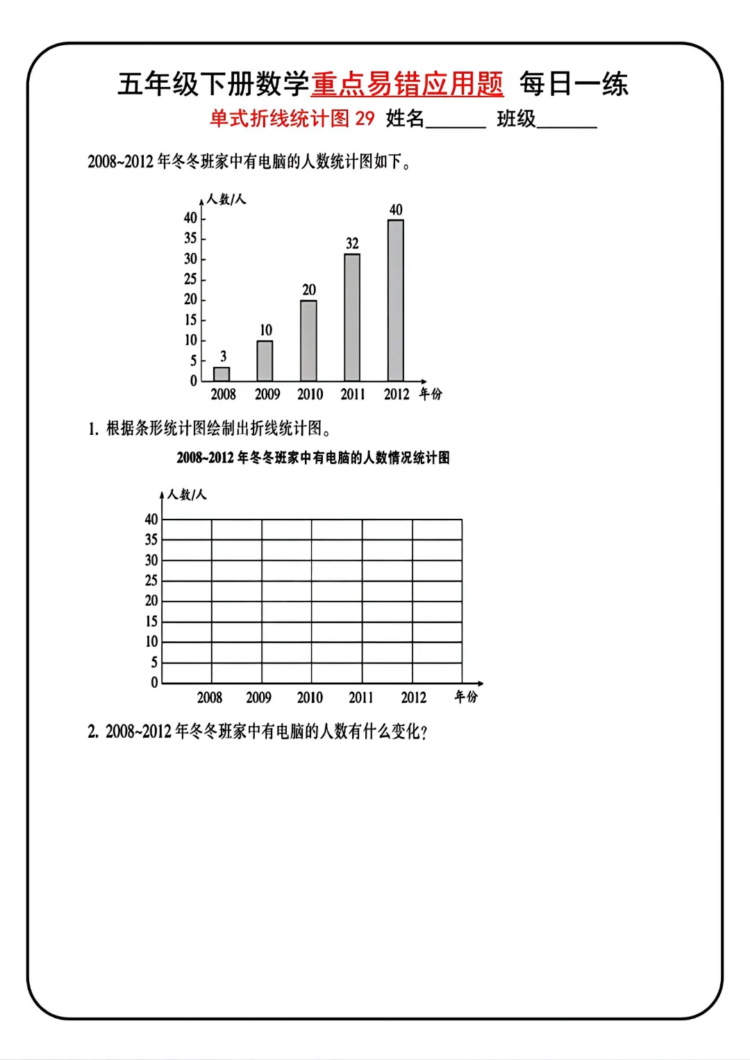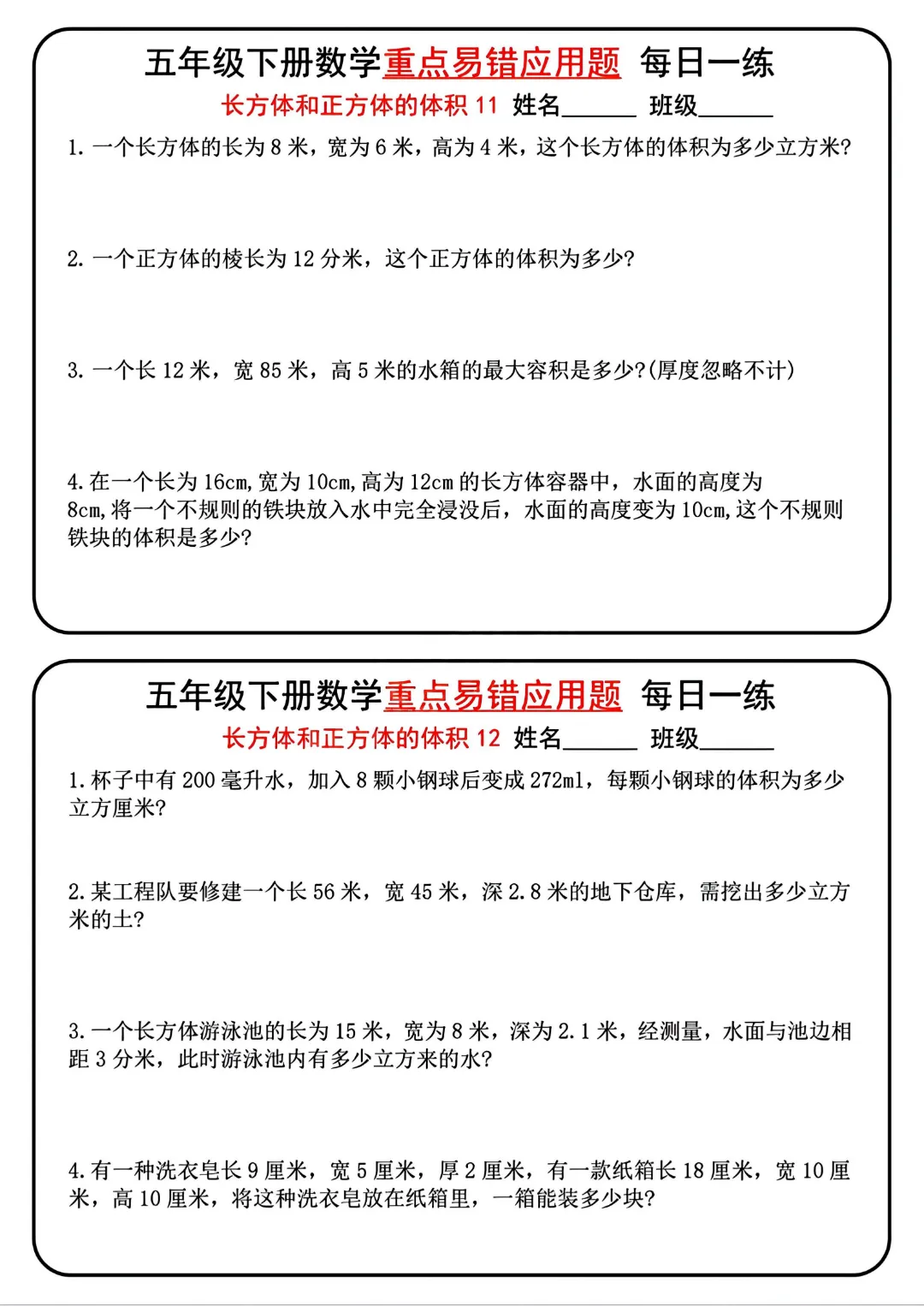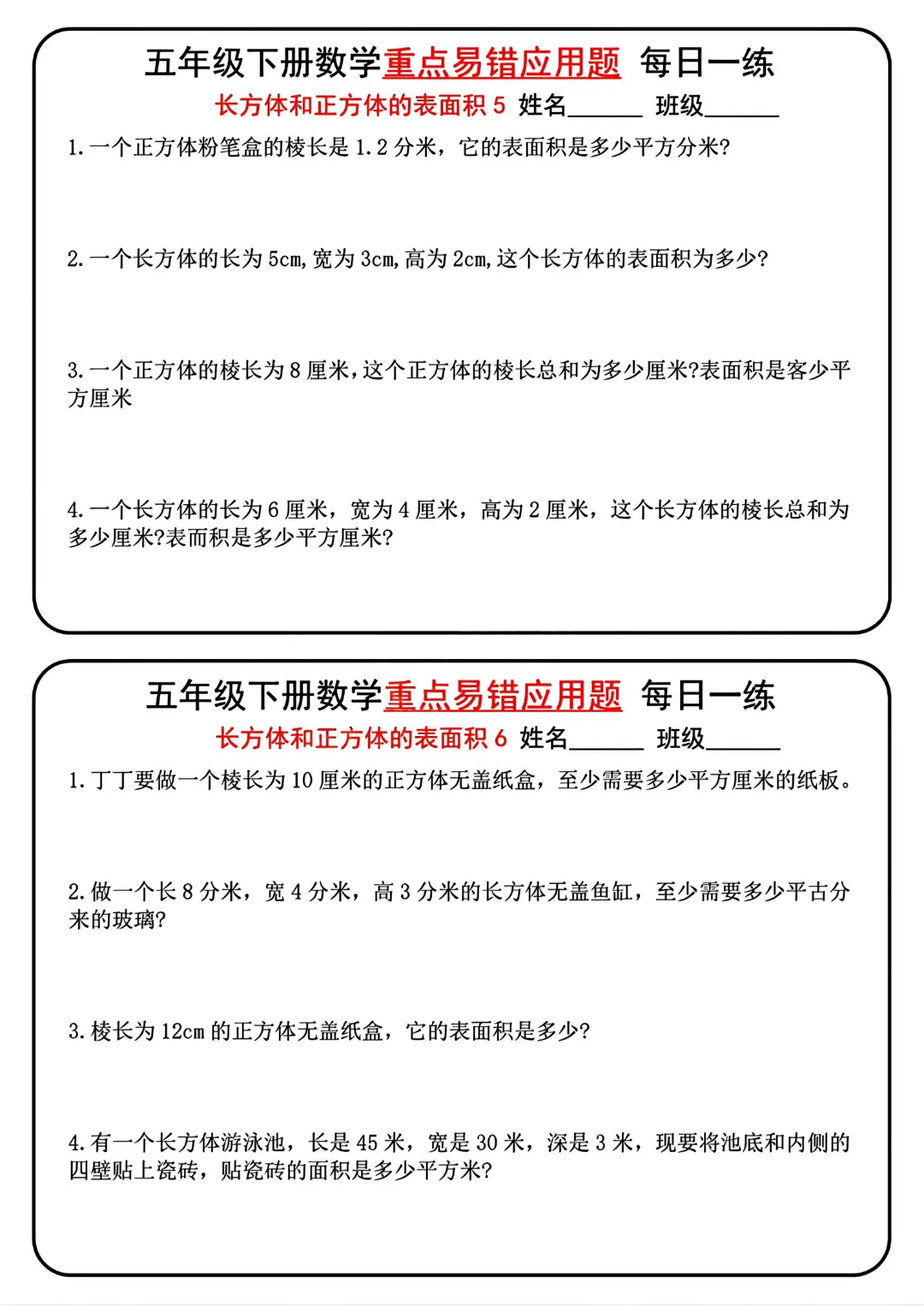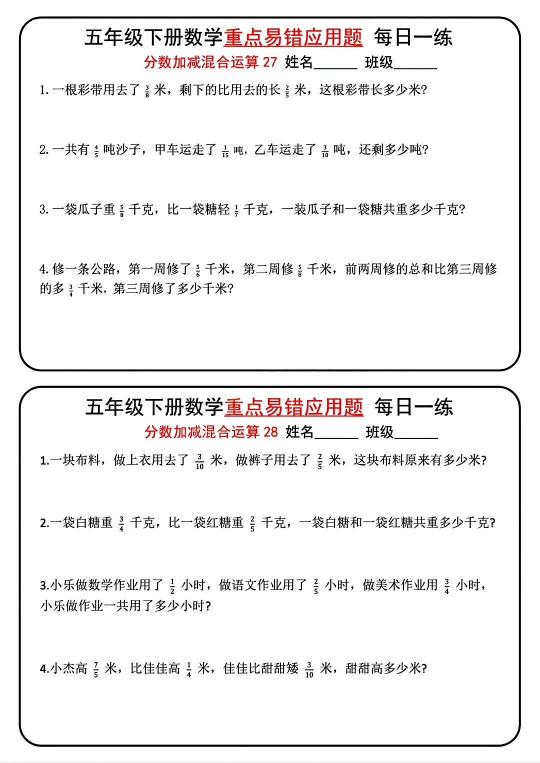 今天给大家分享的是:【五年级下册数学】【通用版】重点易错应用题每日一练|完整高清电子版可打印